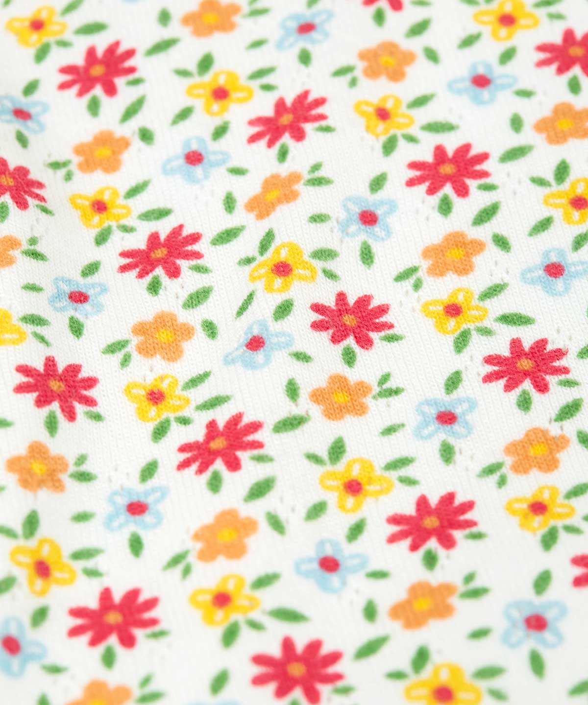 A close up of the top from the Frugi white pointelle organic cotton long sleeved kids pyjamas with a ditsy flower all over print. The print has pink, yellow, orange and blue coloured flowers.