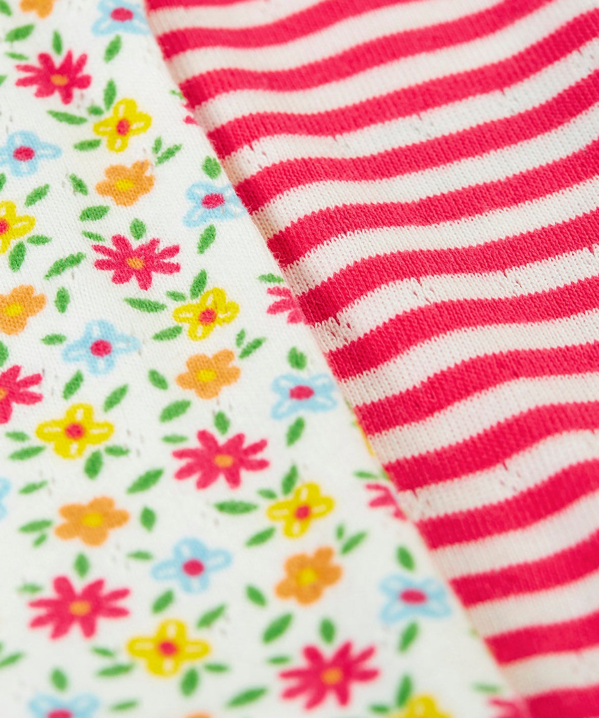 A close up of the pointelle material of the Frugi Pointelle short sleeved baby vest 2 Pack, one with a Ditsy Floral all over print the other has a pink and white stripe design.