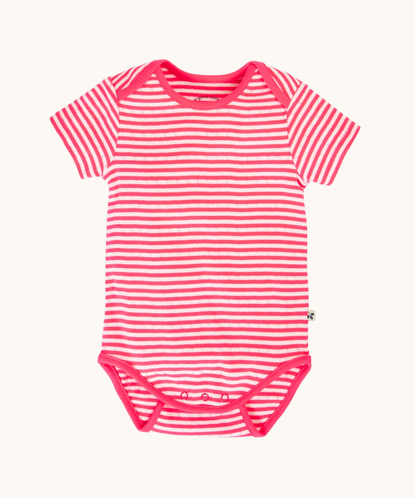 The pink and white striped baby vest from the Frugi Pointelle short sleeved baby vest 2 Pack, one with a Ditsy Floral all over print the other had a pink and white stripe design.