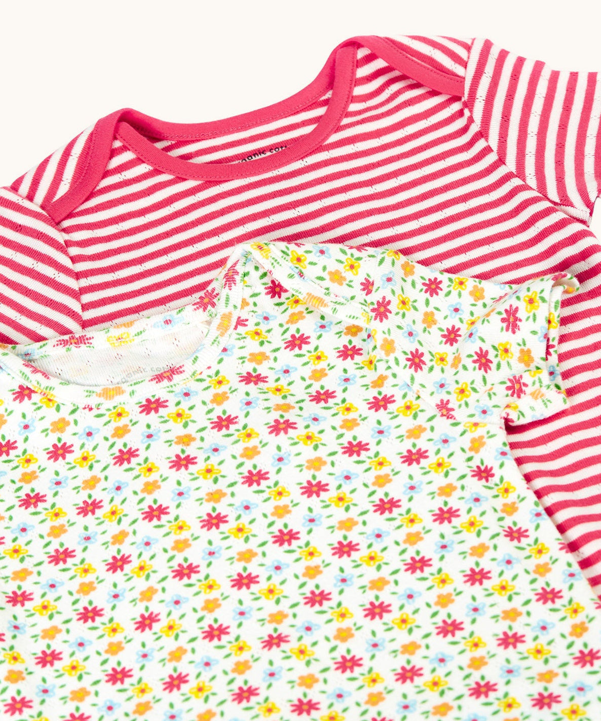 A close up of the Frugi Pointelle short sleeved baby vest 2 Pack, one with a Ditsy Floral all over print the other had a pink and white stripe design.