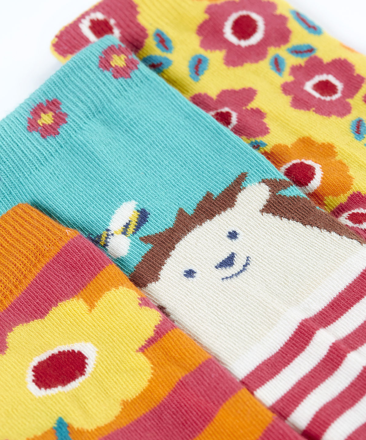 Frugi 3 pack organic cotton socks laid flat. In garden themed colours and designs