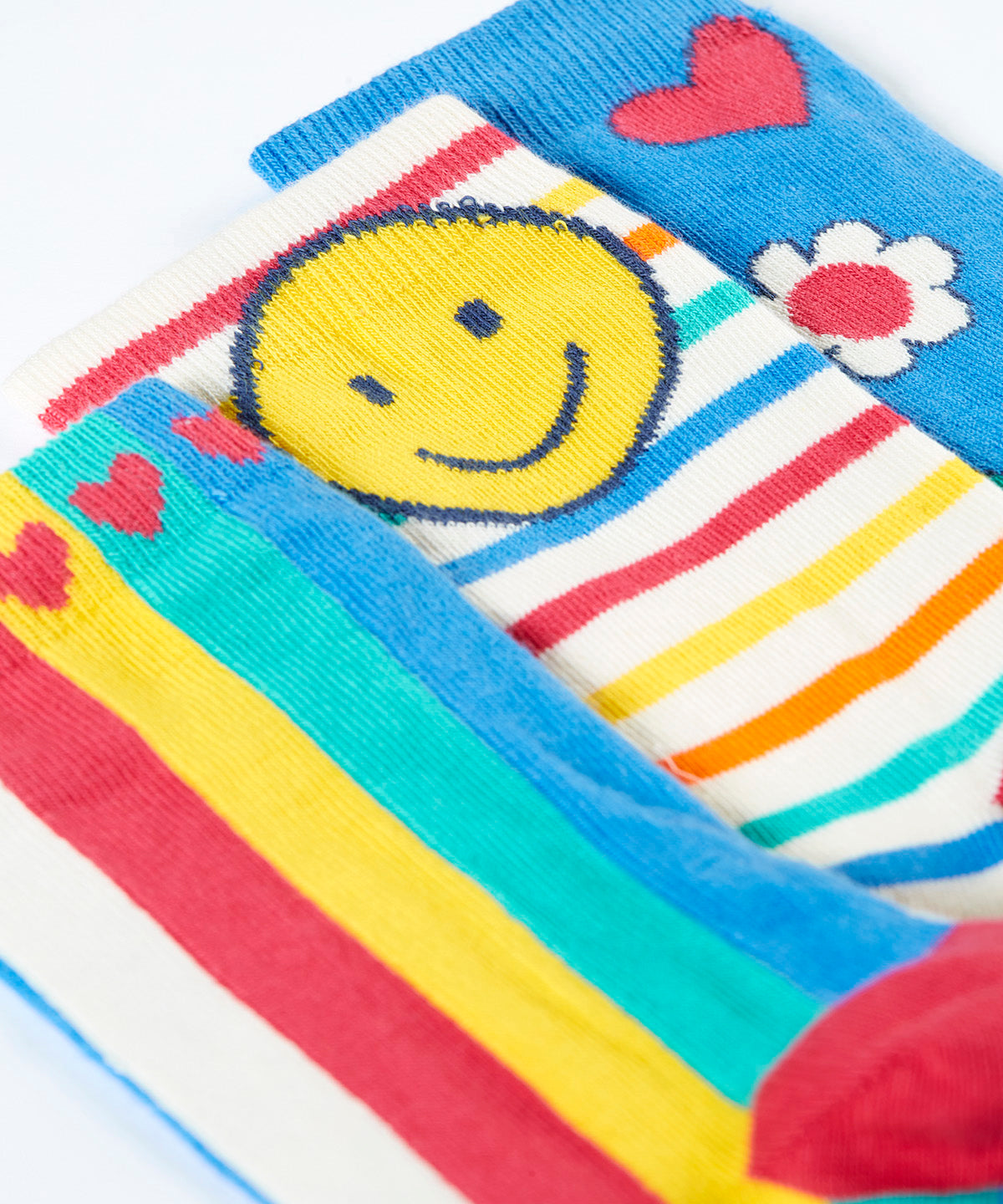 The Happy 3 pack includes one pair in a rainbow candy stripe with a smiley face at the ankle, one blue pair with retro smileys, flowers, and stars woven all over, and one pair in a vertical pastel rainbow stripe finished with small hearts at the ankles. Each pair has comfy ribbed cuffs and a stretchy fit designed for everyday wear.