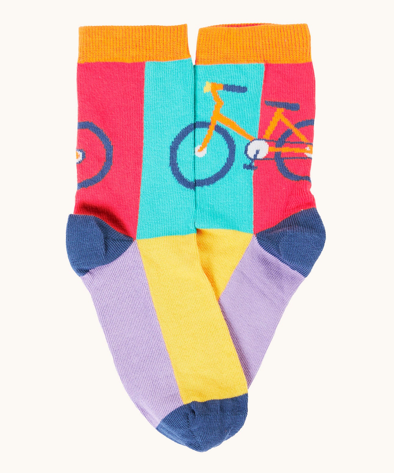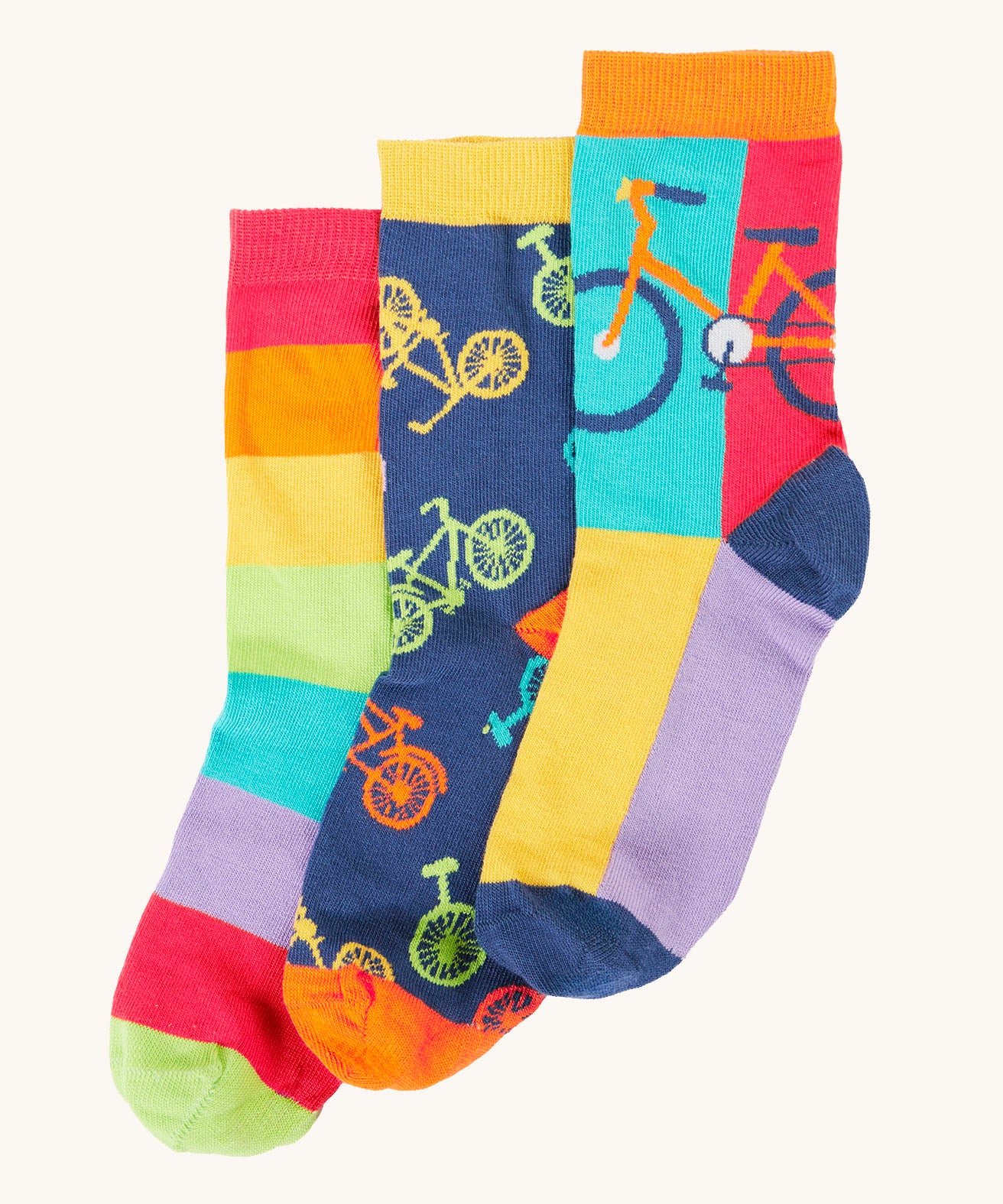 Frugi 3 pack organic cotton socks laid flat. In cycling themed colours and designs