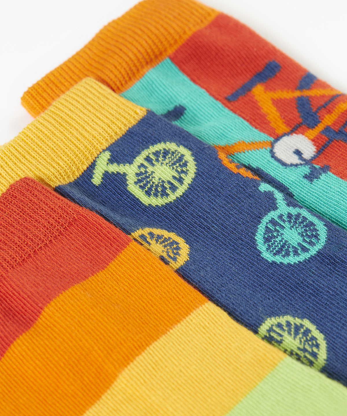 A close up of the cycling themed Frugi 3 pack organic cotton socks laid flat showing the elasticated cuff detail