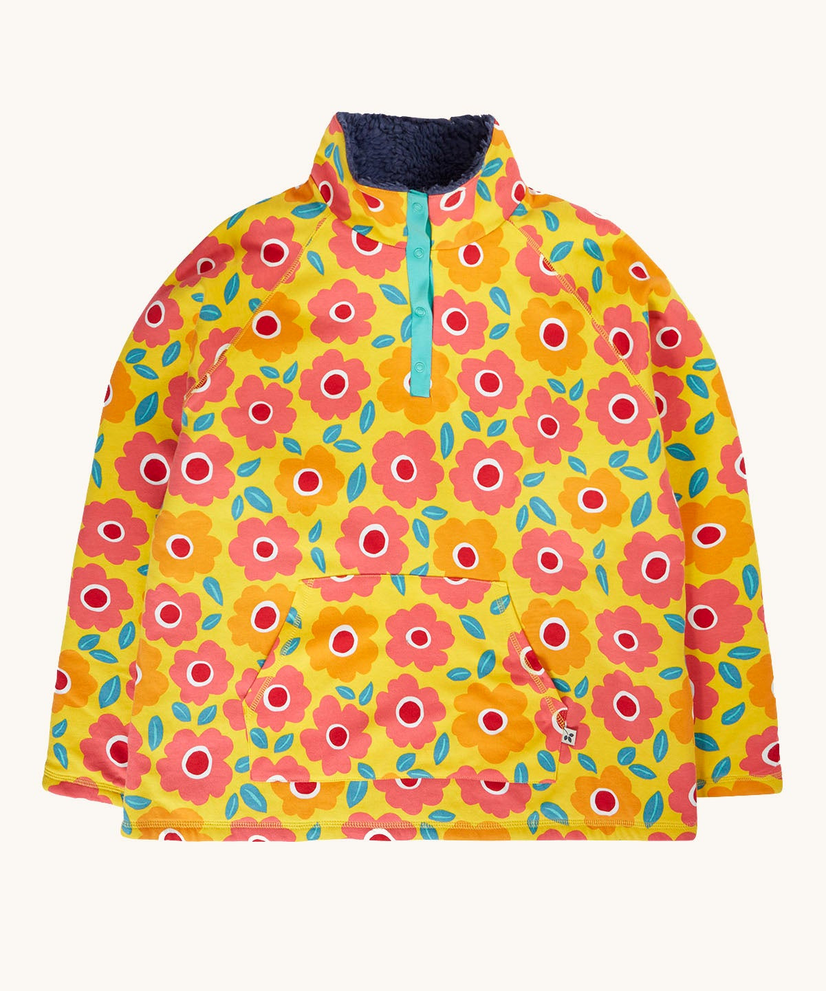 The bright yellow outer is printed with an all-over floral design in pink and orange tones, while the inside is lined with soft, organic navy fleece for added warmth. Made from 100% organic cotton, this GOTS-certified fleece sweater is free from harsh chemicals and gentle on sensitive skin.