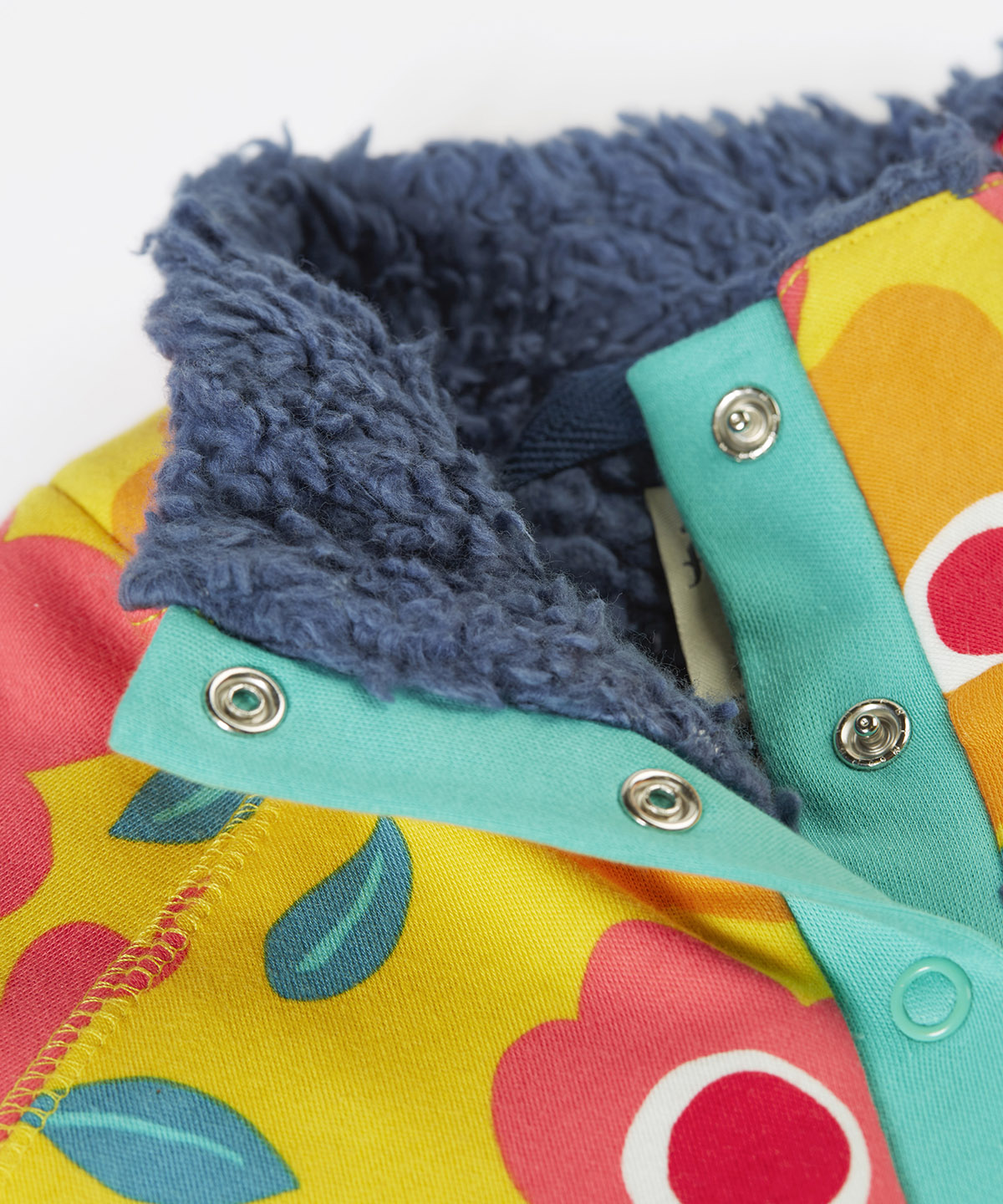 Frugi organic cotton fleece laid flat. In yellow with a navy fleece inner and a repeating floral print with a 1/4 length popper fastener