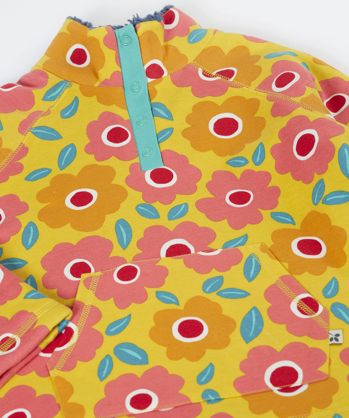 A close up of the yellow Frugi organic cotton fleece laid flat showing the repeating floral print and pouch pocket
