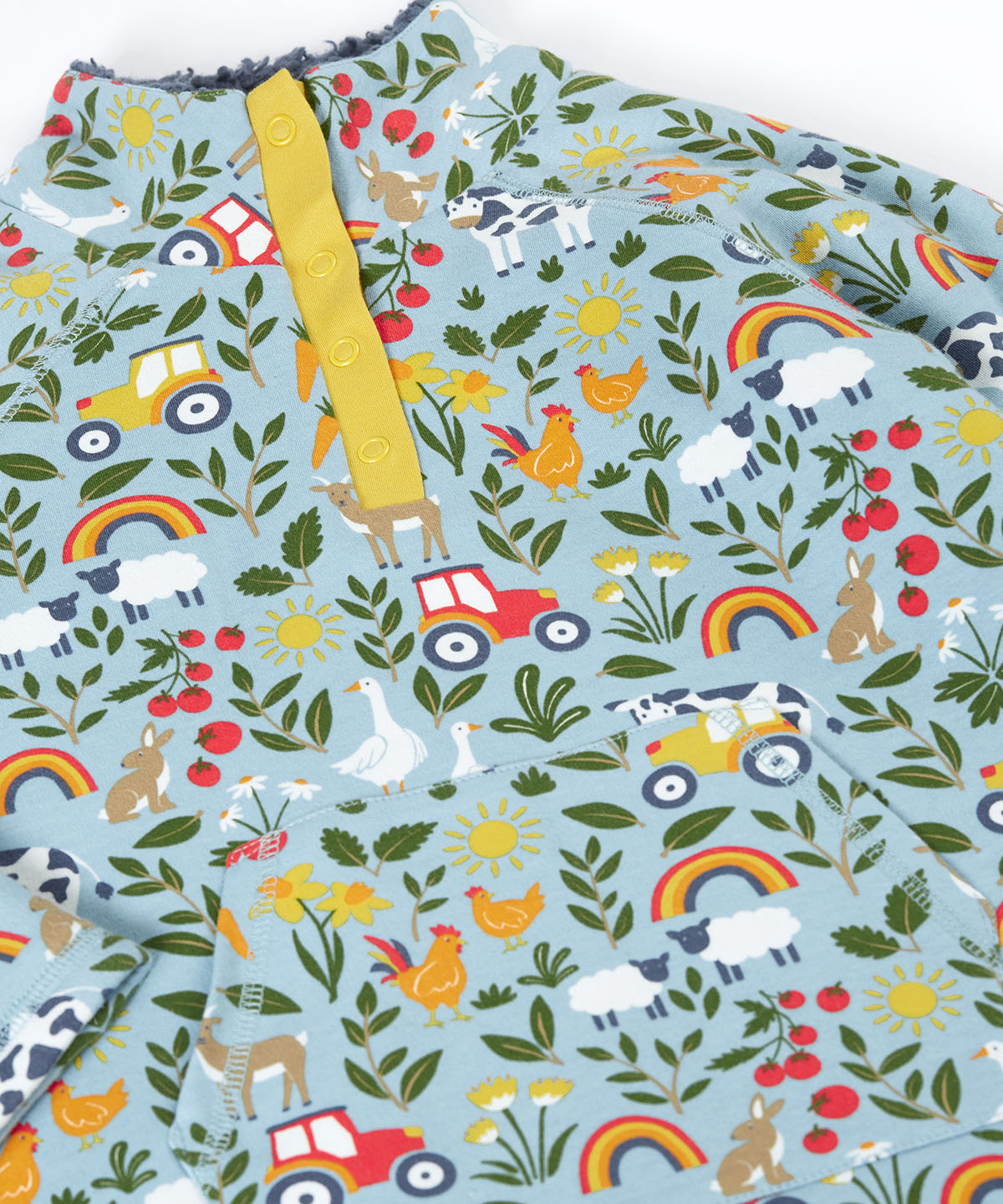 A close up of the light blue Frugi organic cotton fleece laid flat showing the repeating farm themed print and pouch pocket.
