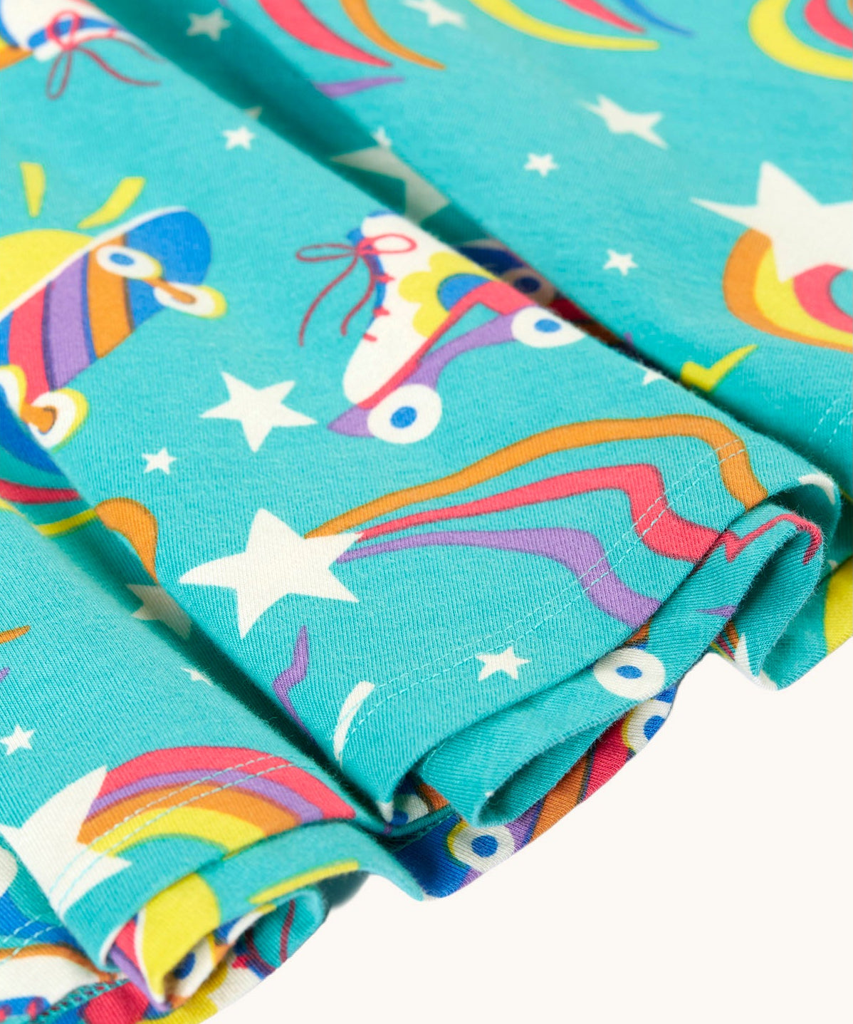 A close up of the turquoise skater dress laid flat showing the repeating roller blades and skateboard prints with colourful shapes.