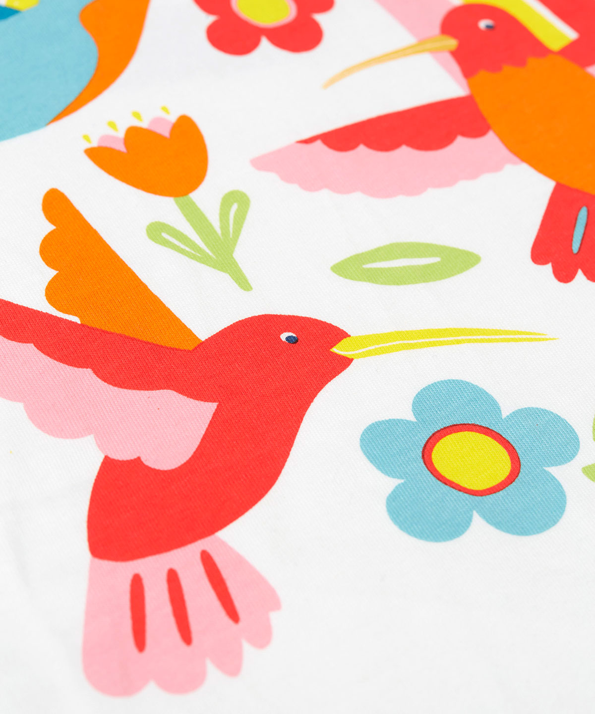 A close up of the humming bird design on the front of the Frugi raglan t-shirt a red and pink hummingbird surrounded by flowers and two other hummingbirds.