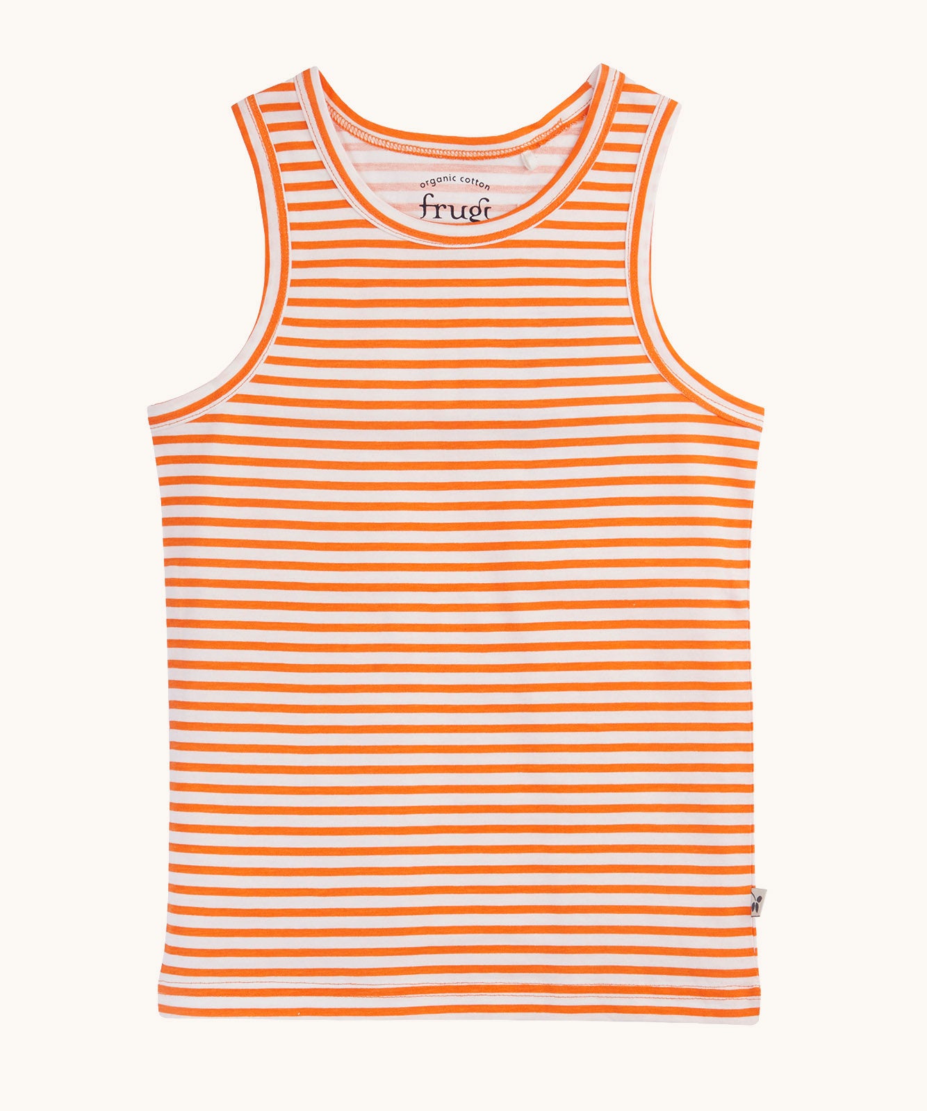 The orange and white striped top from the Frugi varlie vest 2 pack multipack. The vest has a bold orange and white striped design.