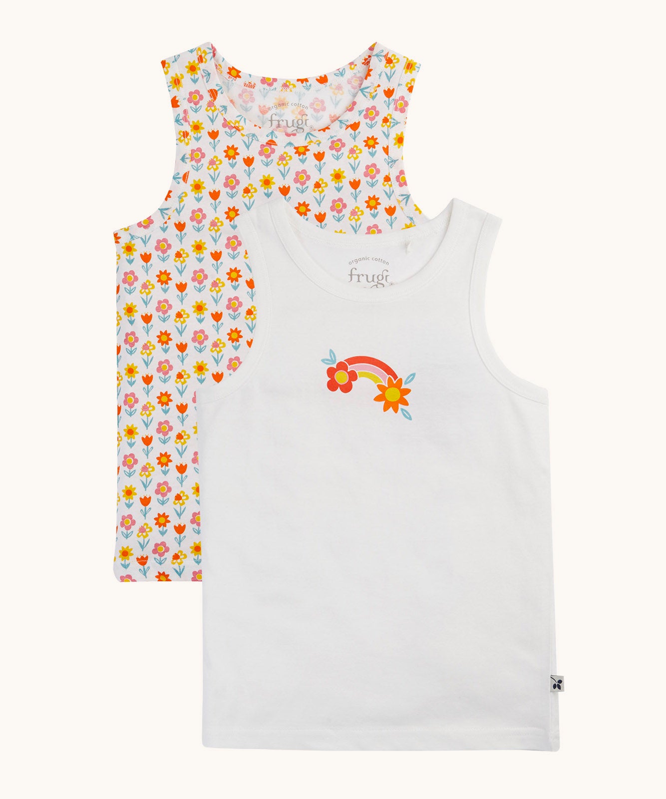 Frugi varlie bloom vest 2 pack multipack. One vest has an all over flower print on a white background with the other featuring a rainbow and flower graphic in the middle of the chest area on a white background.