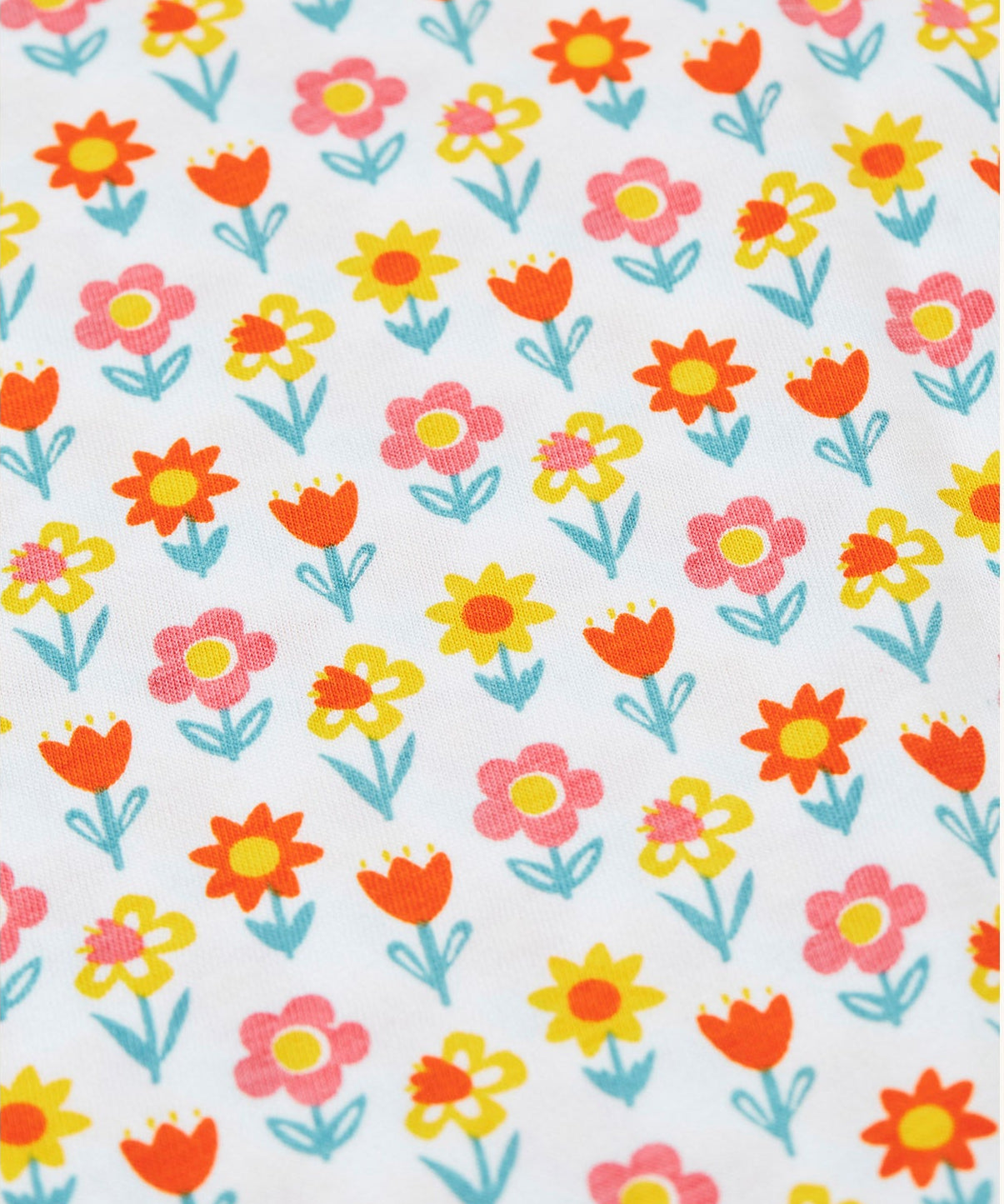 A close up of the orange, yellow, pink and turquoise coloured bloom flower print on one of the organic cotton children's vests from the Frugi varlie bloom vest 2 pack multipack.