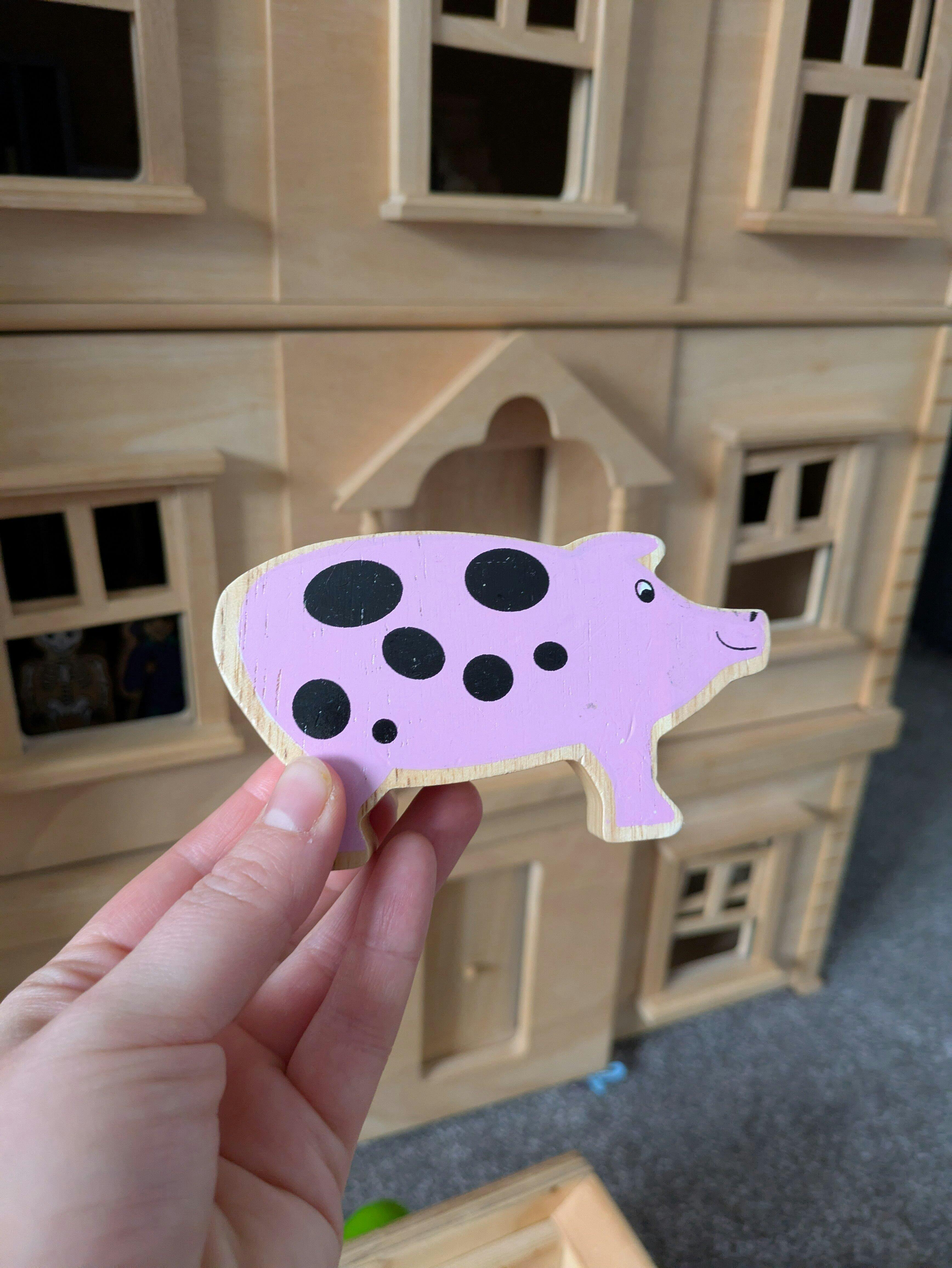 Oink, oink! This Lanka Kade Pink Spotted Pig loves to roll in the mud and is great for playing with on a toy farm. This figure has been hand-crafted from sustainably managed rubberwood and has been painted on the back and front, adding gorgeous details while still showing off the natural beauty of the wood around the side. This fair trade wooden animal figure is perfect for teaming up with other farmyard animals from the range. Lanka Kade painted figures are hand painted in lovely bright colours.