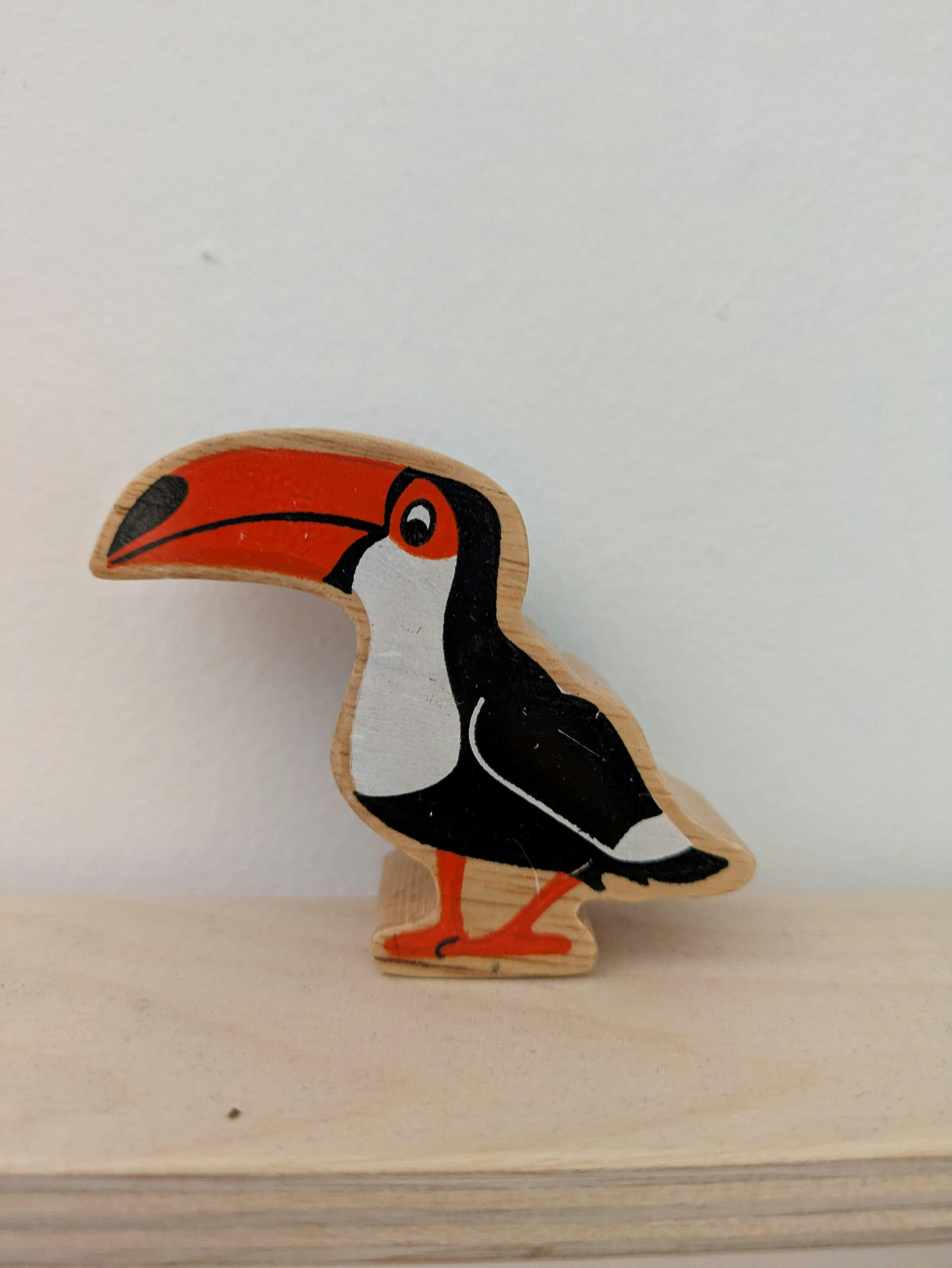 This painted Lanka Kade Black & Orange Toucan is a chunky wooden figure with a black and white body, with a striking orange beak on each side with natural edges to show off the grain of the wood. Team up this wooden exotic bird figure with some tropical friends and enjoy as part of an animal and bird collection.
