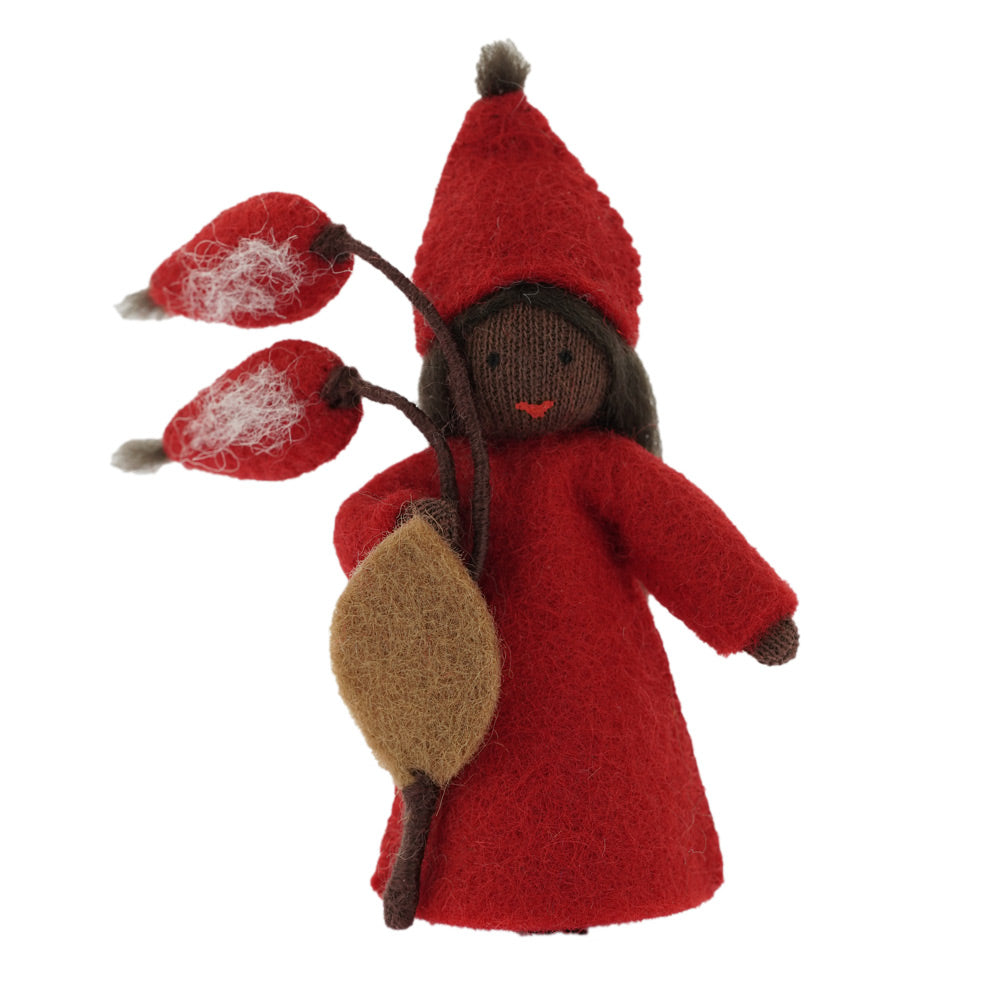 Cette fée de rose musquée de Noël Ambrosius est une poupée Waldorf festive tenant trois boutons de rose musquée, parfaite pour une exposition saisonnière hivernale. Cette figurine en laine feutrée issue du commerce équitable a la peau noire, les cheveux noirs et porte une robe rouge fluide et un grand chapeau avec une couche de neige. Cette fée des fleurs d'hiver aura fière allure avec d'autres fées des fleurs, nichée près d'un anneau de fête ou placée entre les branches d'un arbre de Noël.