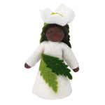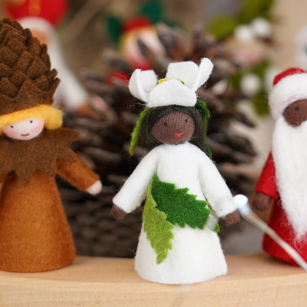 Célébrez la saison des fêtes avec cette fée couronne de roses de Noël Ambrosius - une petite poupée Waldorf inspirée de la rose blanche et jaune qui fleurit pendant les mois d'hiver. Cette figurine en laine feutrée du commerce équitable a la peau noire, de longs cheveux bruns et porte une robe blanche ornée de feuilles vertes et a une fleur rose de Noël sur la tête. Placez cette fée des fleurs sur une table de présentation saisonnière avec des baies et des plantes d'hiver pour célébrer Noël ou blottissez-la parmi les branches d'un arbre de Noël.