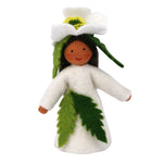 Célébrez la saison des fêtes avec cette figurine de rose de Noël - une petite poupée Waldorf inspirée de la rose blanche et jaune qui fleurit pendant les mois d'hiver. Cette figurine en laine feutrée issue du commerce équitable a la peau châtain clair, de longs cheveux bruns et porte une robe blanche ornée de feuilles vertes et a une fleur rose de Noël sur la tête. Placez cette fée des fleurs sur une table de présentation saisonnière avec des baies et des plantes d'hiver pour célébrer Noël ou blottissez-la parmi les branches d'un arbre de Noël.