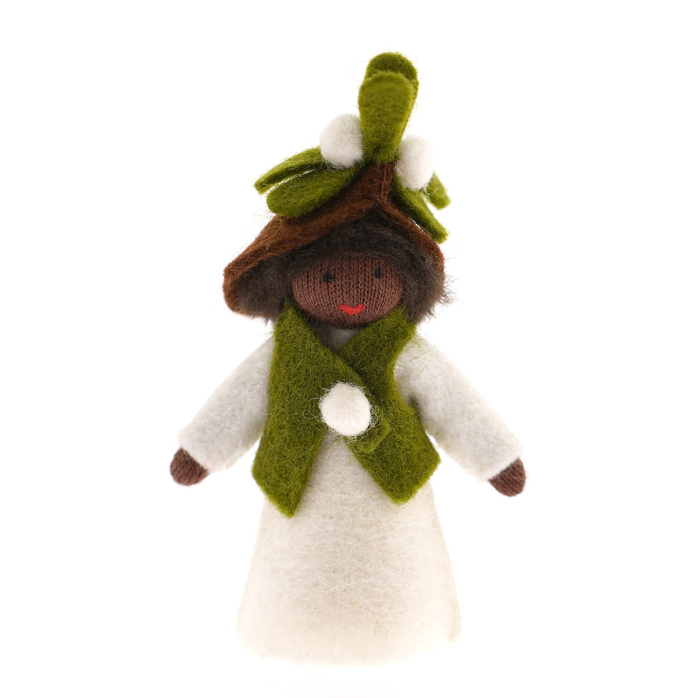 Cette petite figurine Ambrosius Mistletoe est prête pour la saison de Noël avec une décoration en forme de gui. Cette figurine en laine feutrée issue du commerce équitable a la peau noire, des cheveux bruns courts et porte une robe blanche avec une écharpe verte et des feuilles de gui et des baies sur son chapeau marron. Cette poupée garçon Waldorf sera ravissante sur une table saisonnière d'hiver ou une vitrine de Noël. Placez cette fée des fleurs sur une table de présentation saisonnière avec des baies et des plantes d'hiver pour célébrer Noël ou blottissez-la parmi les branches d'un arbre de Noël.
