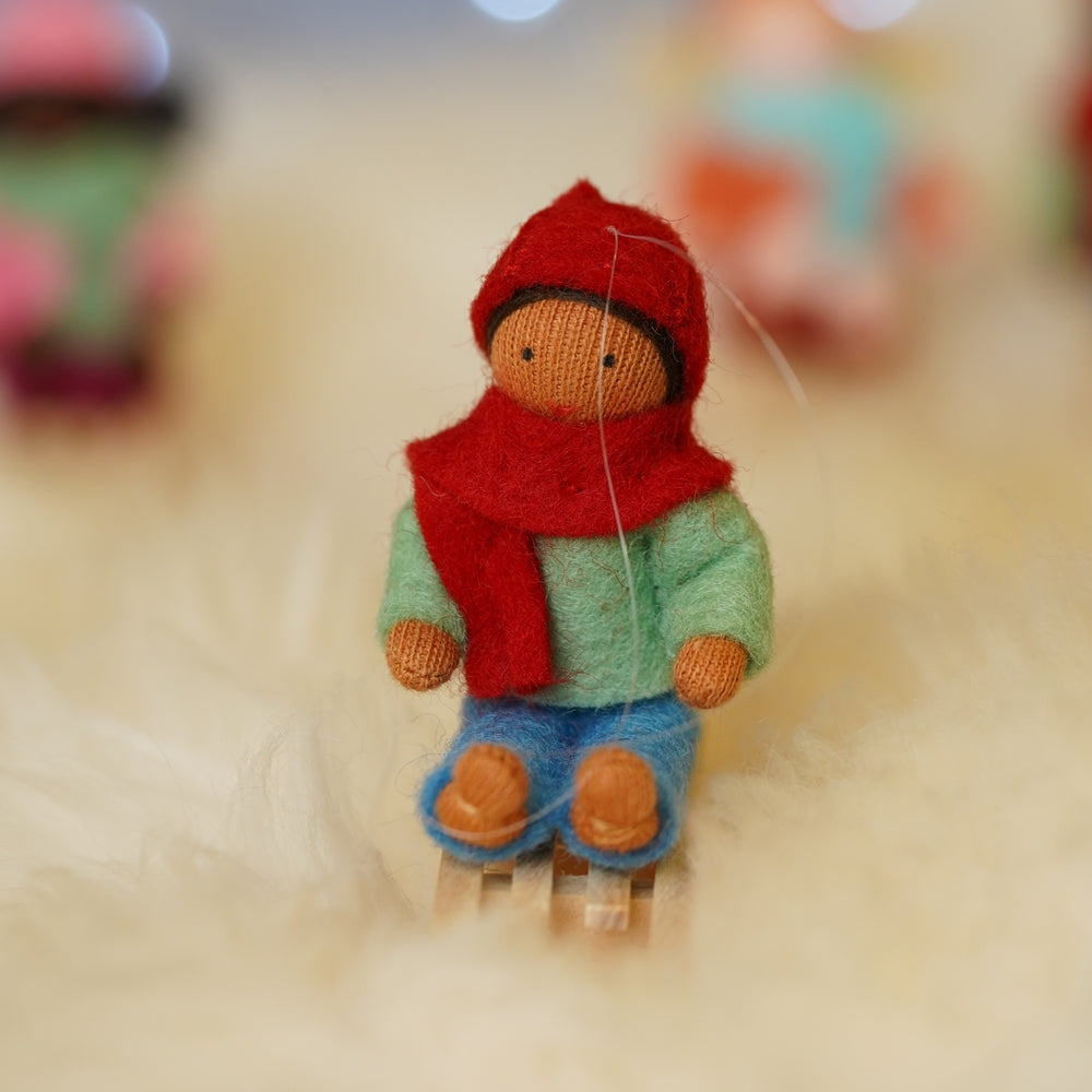 Ce garçon suspendu sur traîneau Ambrosius est une décoration de sapin de Noël en laine feutrée issue du commerce équitable avec une peau marron clair, une tenue d'hiver chaude et un petit traîneau en bois. Accrochez-le aux branches de votre sapin de Noël pour célébrer les fêtes de fin d'année ou asseyez-vous sur un présentoir saisonnier avec des baies d'hiver.