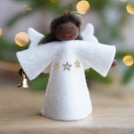 Ce petit ange Ambrosius avec cloche est une figurine en laine feutrée du commerce équitable avec une peau noire, des traits du visage délicatement peints, une longue robe blanche avec un col à volants, une étoile sur la tête et tenant une petite cloche dorée. Cet ange festif est un joli petit cadeau pour Noël et constitue un complément parfait pour décorer une table d'exposition sur la nature en hiver. Vous pouvez même utiliser la boucle de ficelle dorée pour l'accrocher à votre sapin de Noël ou autour de votre maison.