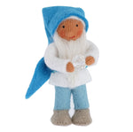 Ce joli petit gnome en laine feutrée du commerce équitable est une merveilleuse figure décorative avec des vêtements bleus et blancs, une peau brune et une longue barbe blanche et il tient un cristal. Il est parfait pour ajouter à une bague de célébration ou à une présentation ou une scène saisonnière d'inspiration Waldorf.