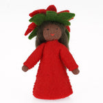 Cette fée fantaisiste de la couronne Ambrosius Poinsettia est une figurine en laine feutrée du commerce équitable avec une peau noire, une robe rouge et une fleur de poinsettia festive sur la tête. Cette petite poupée Waldorf est une fée des fleurs idéale à placer sur une table d'exposition saisonnière pour célébrer l'hiver, ou à se blottir dans les branches d'un arbre de Noël. Pliez les bras en position et tenez-vous droit. Faites équipe avec d'autres figurines Waldorf et des fées feutrées, de vraies baies, fleurs et feuilles pour une présentation qui célèbre les saisons et le monde naturel de votre maison.