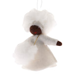 Cette décoration à suspendre Ambrosius en forme de flocon de neige est une décoration de sapin de Noël en laine feutrée issue du commerce équitable avec une peau noire, des cheveux blancs, une belle robe blanche, un flocon de neige à pompon moelleux sur la tête et un sac de boules de neige. Accrochez cette décoration de poupée Waldorf aux branches d'un arbre de Noël ou placez-la sur une table saisonnière pour une présentation festive.
