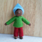 L'enfant elfe Ambrosius est une figurine décorative en feutre Waldorf faite à la main avec une peau noire, des cheveux bruns et porte un chapeau d'elfe bleu, une tunique verte et un pantalon marron.