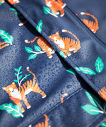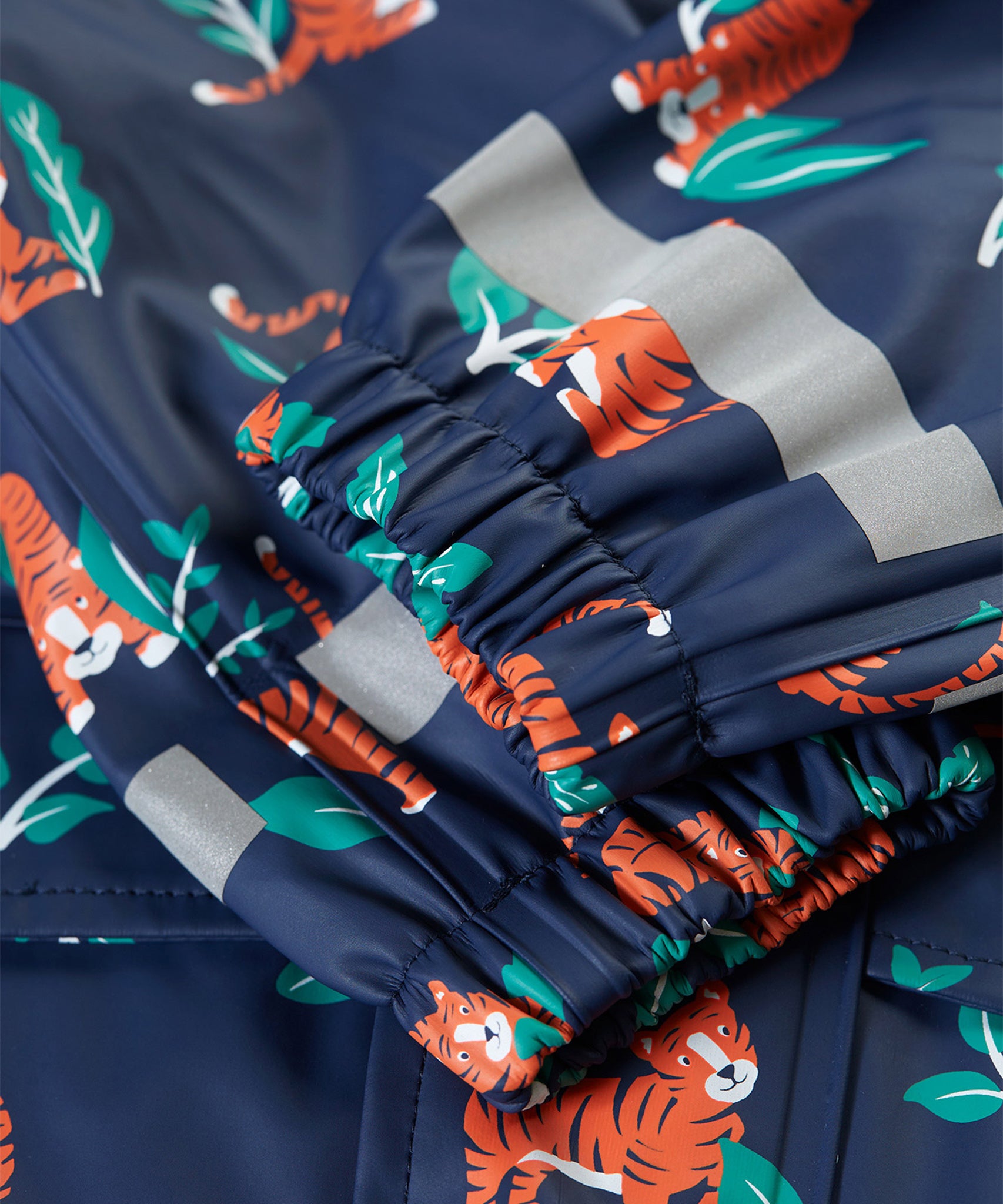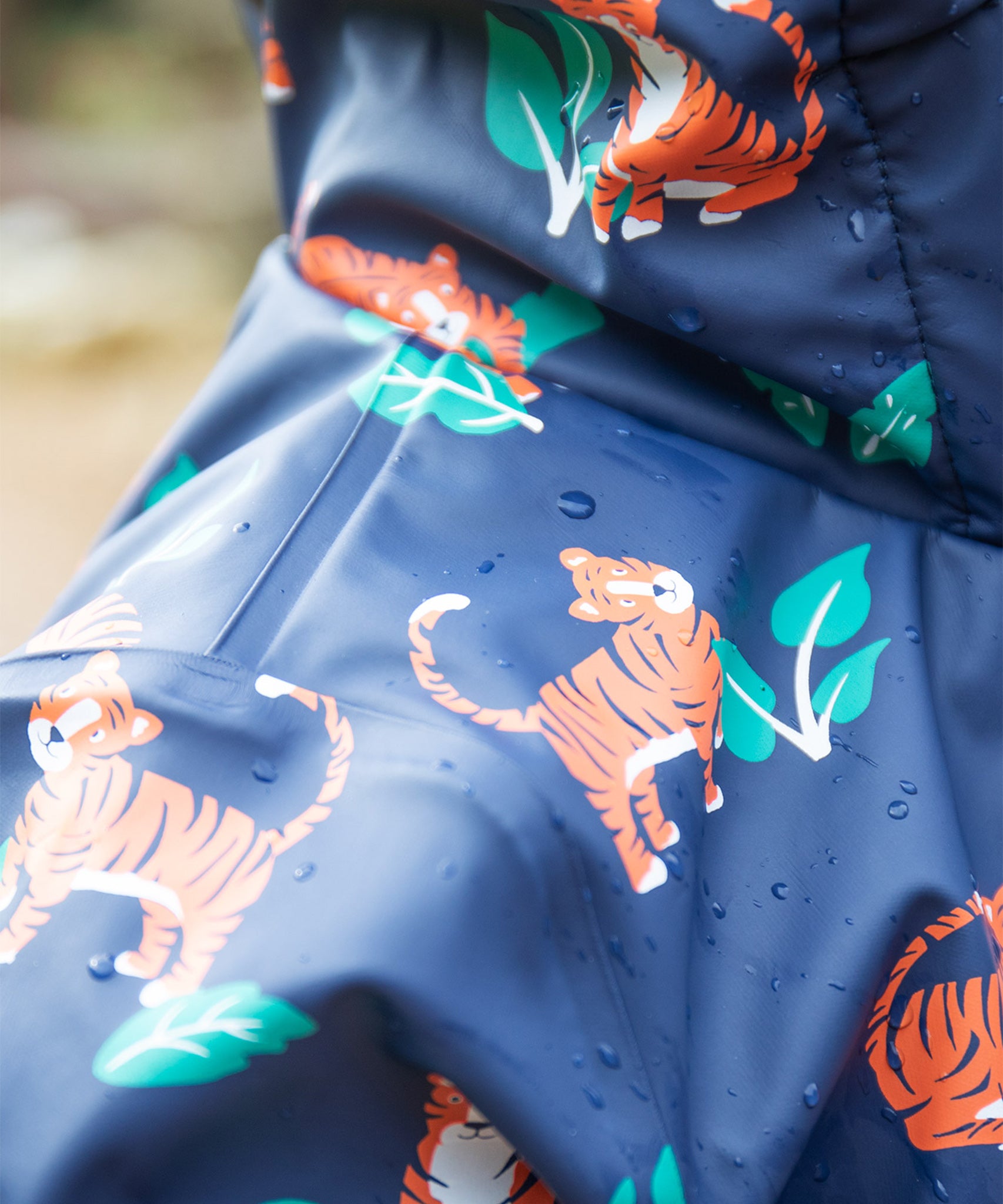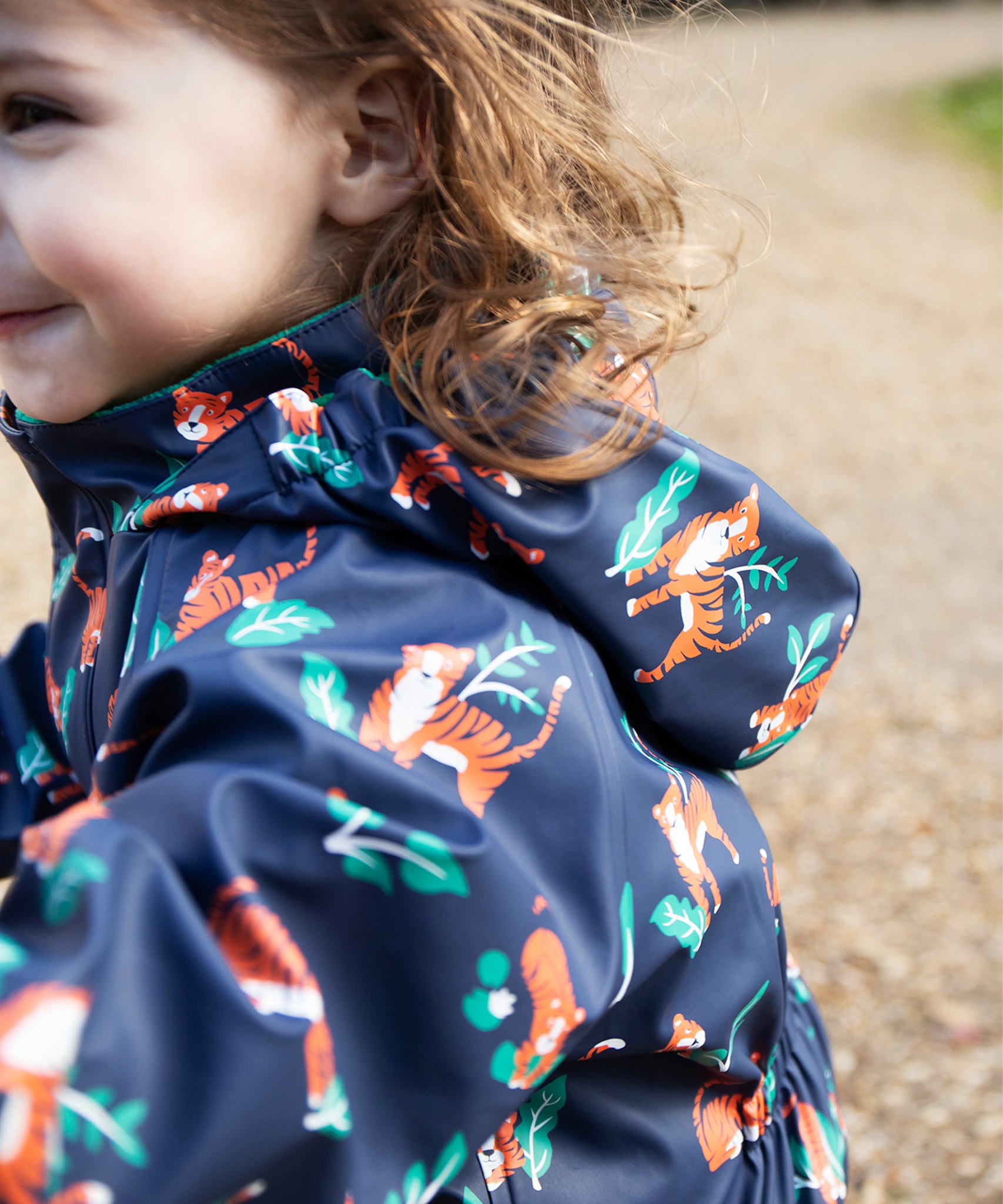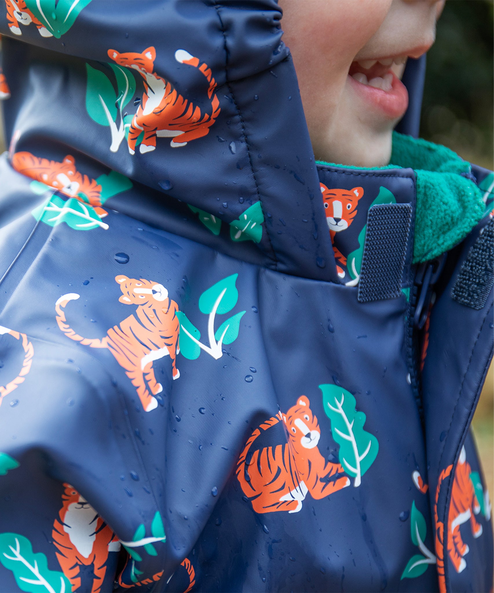 Ce manteau imperméable pour enfant est fabriqué à partir de bouteilles en plastique recyclées à 100 % après consommation et présente un imprimé intégral ludique Tiger Time sur bleu marine avec une doublure en polaire verte super douce. Avec des coutures entièrement soudées à chaud et un indice d'imperméabilité de 10 000 HH, vous pouvez être sûr que vos enfants resteront au sec quel que soit le temps.