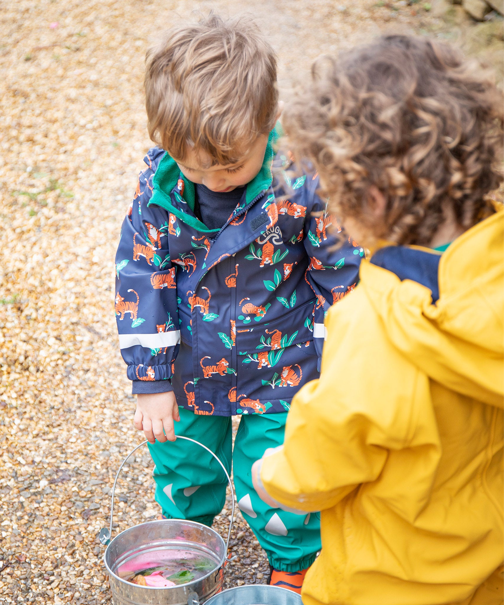 Des averses légères aux averses torrentielles, le manteau Frugi Puddle Buster garde les enfants au chaud, au sec et prêts à sauter dans les flaques d'eau !