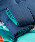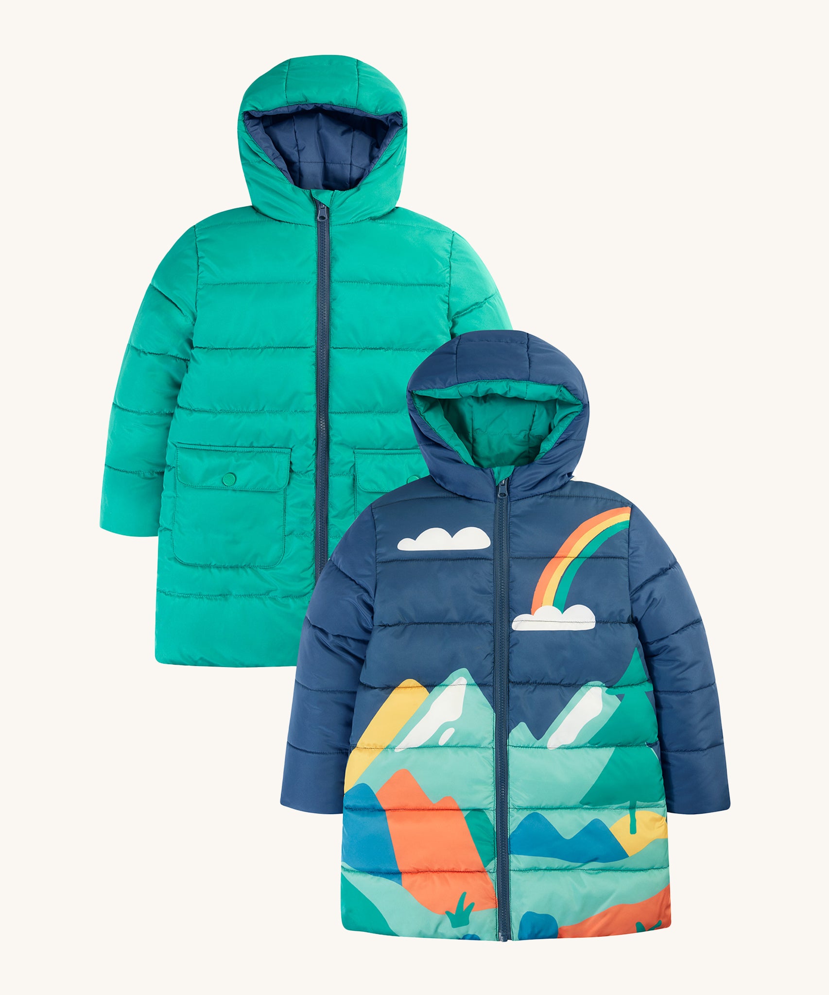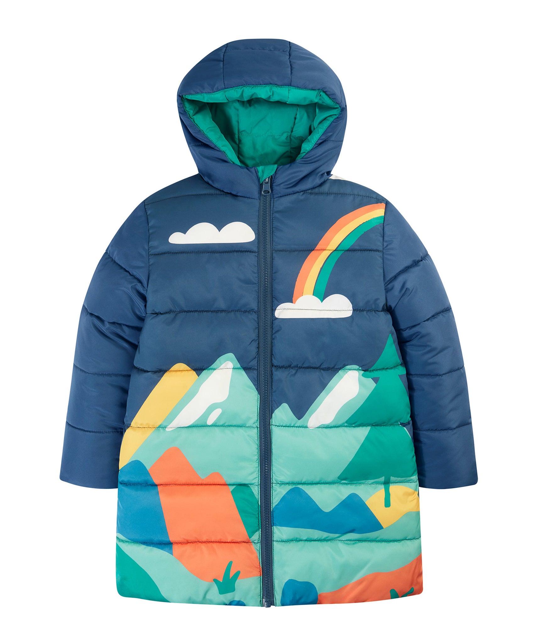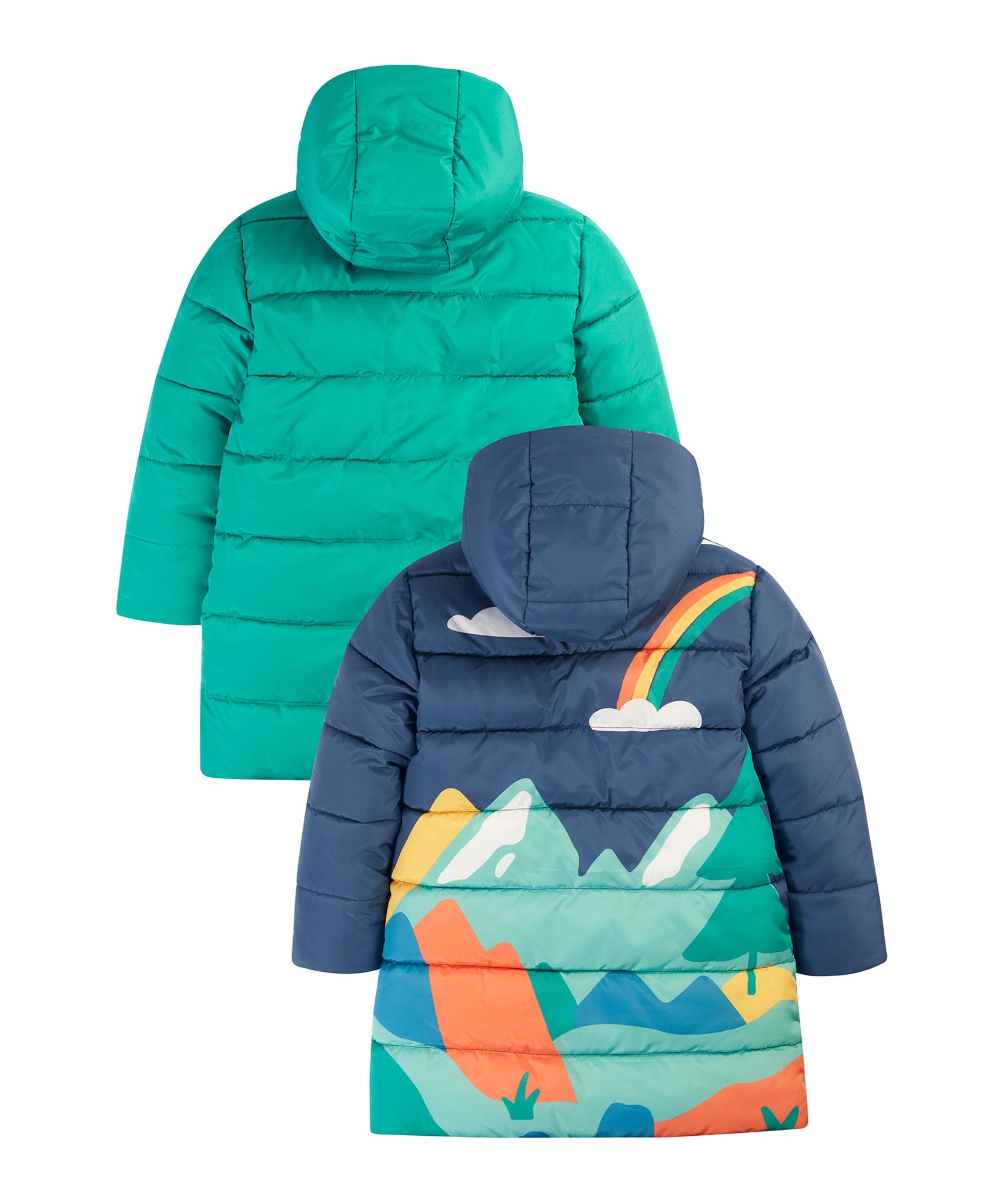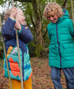 Veste matelassée imperméable et chaude pour enfants avec un design réversible astucieux, la veste réversible Toasty Terrain de Frugi en vue alpine est un aqua brillant d'un côté et un imprimé de paysage alpin joyeux sur bleu marine de l'autre. Cette veste douillette de style doudoune écologique est fabriquée à partir de bouteilles en plastique recyclées à 100 % après consommation et a une longueur plus longue pour un confort optimal cet hiver.