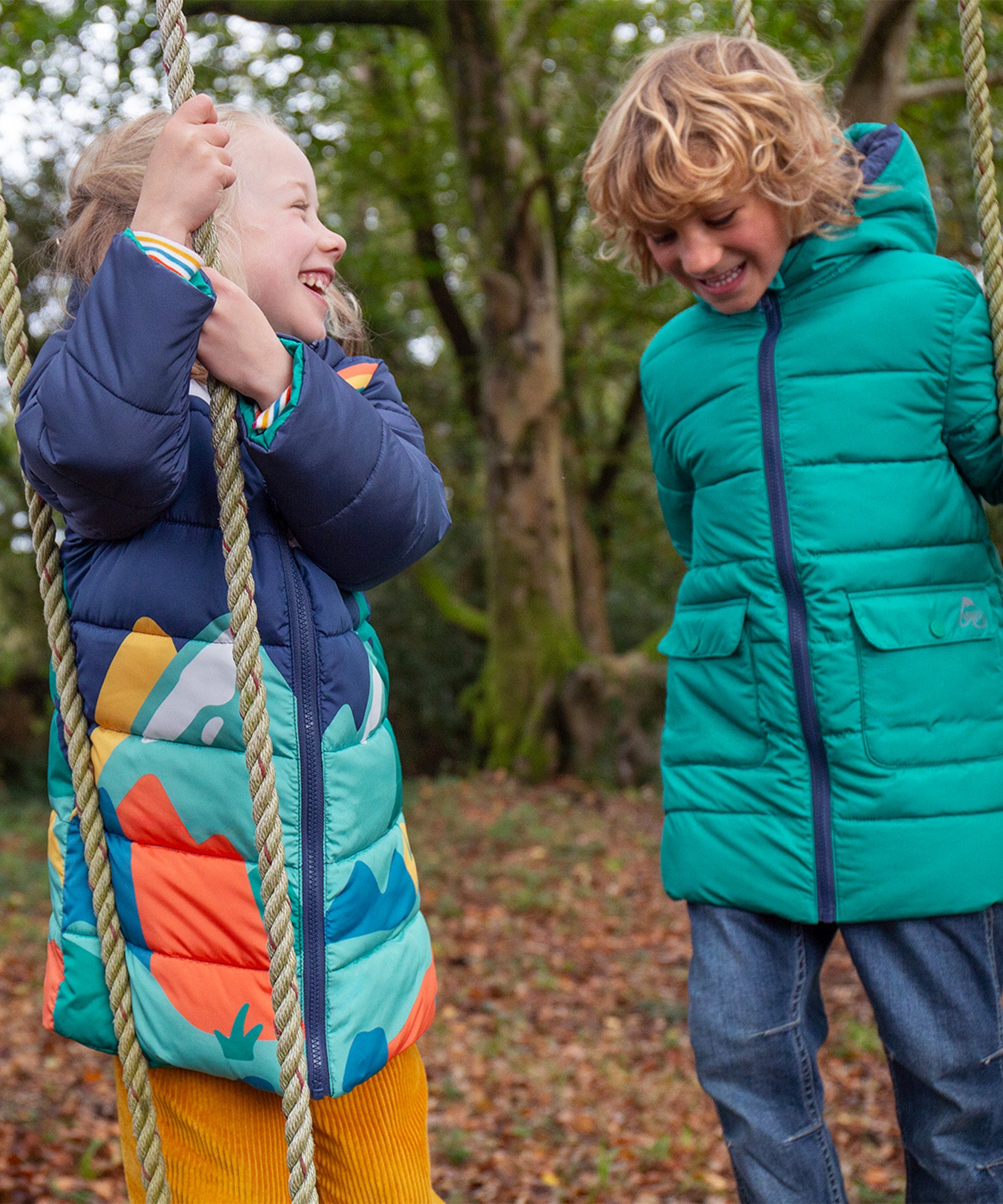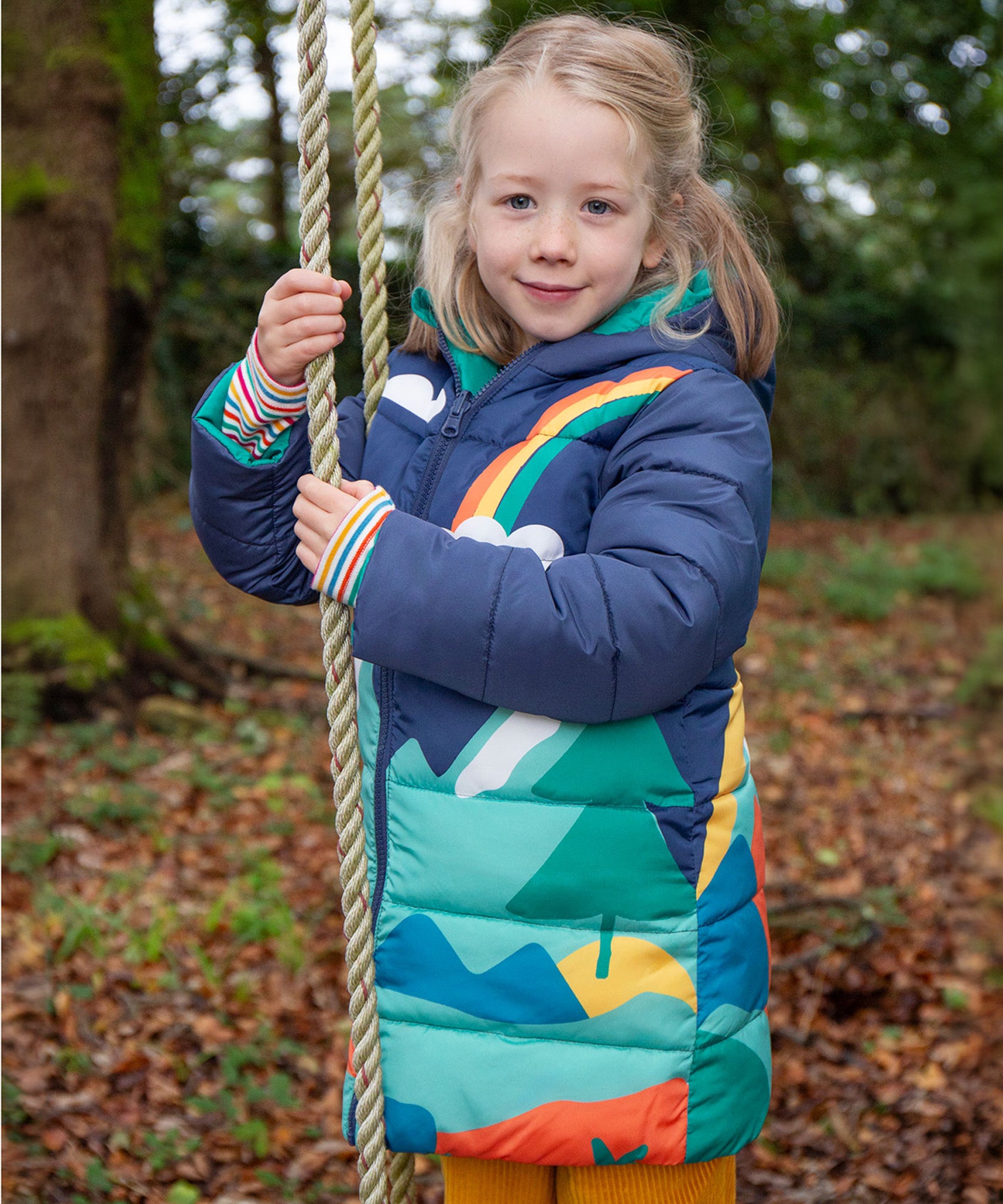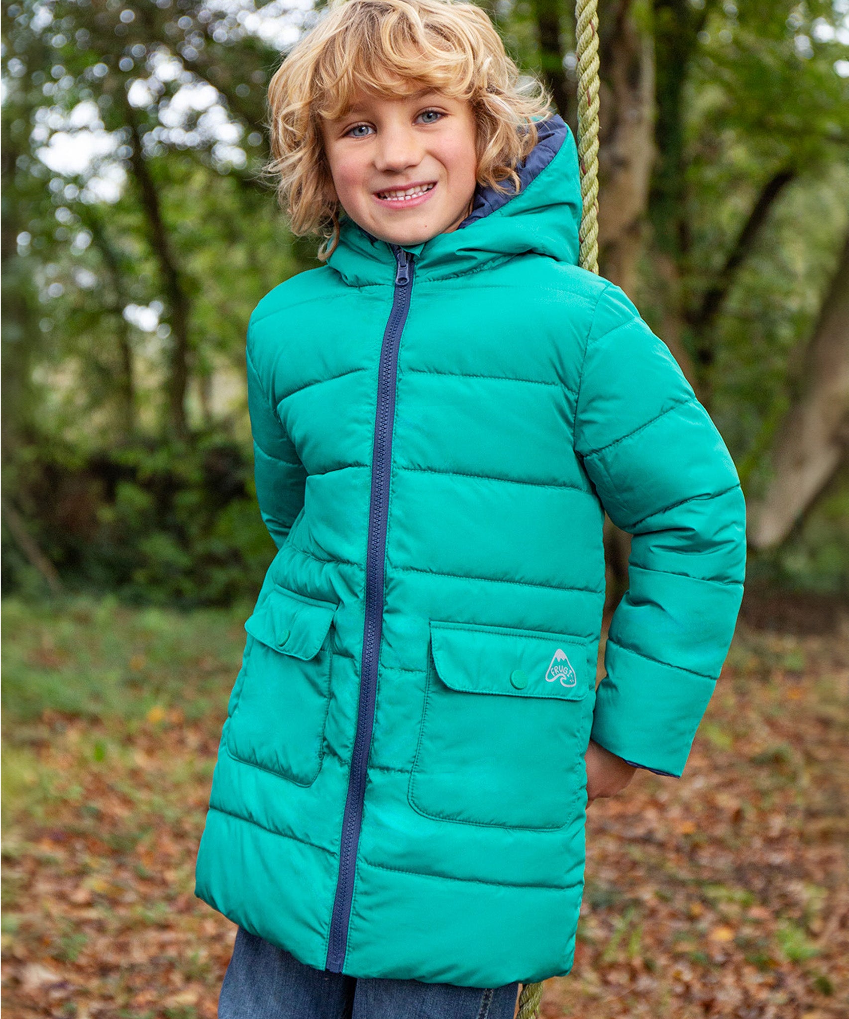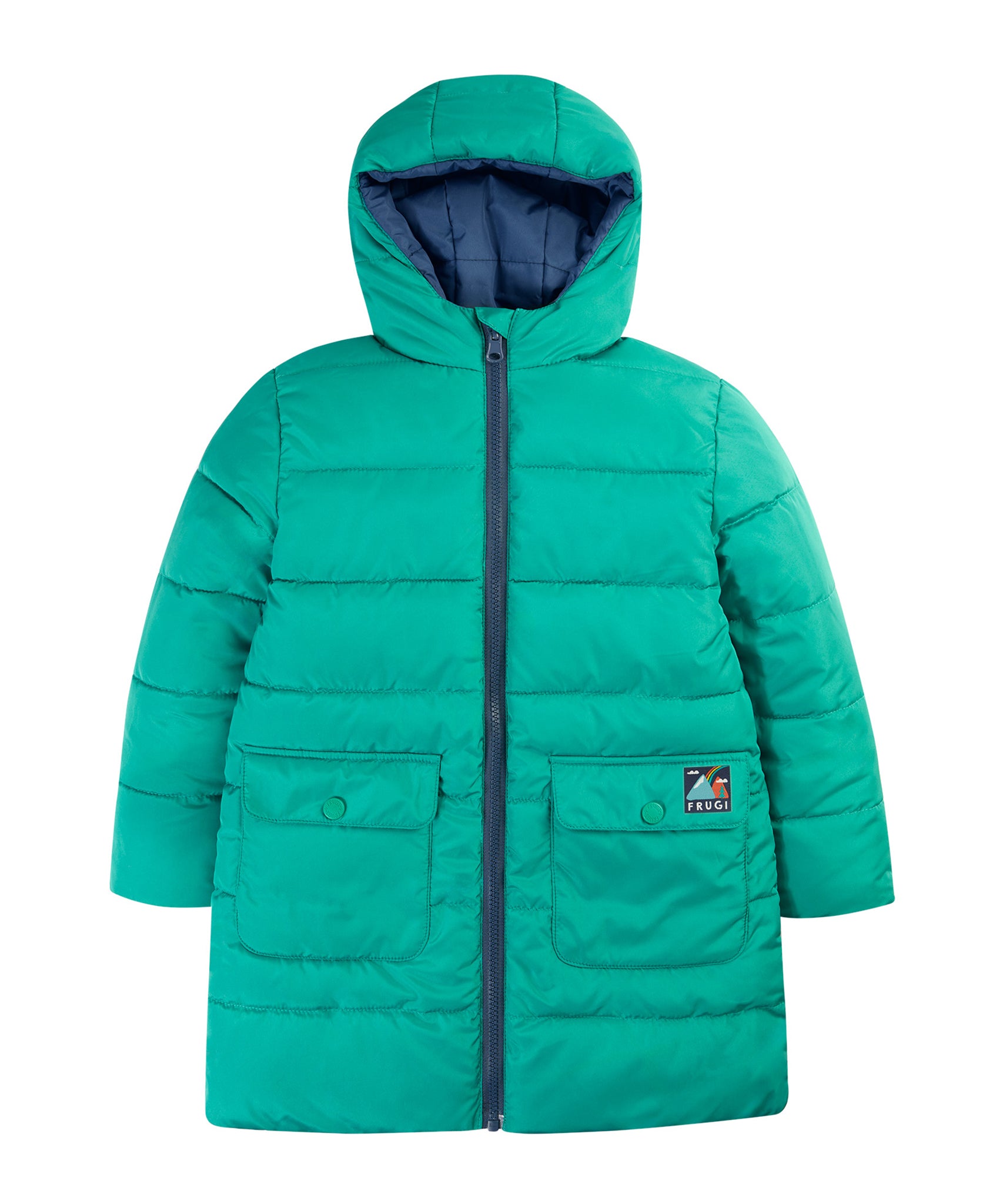 Veste matelassée imperméable et chaude pour enfants avec un design réversible astucieux, la veste réversible Toasty Terrain de Frugi en vue alpine est un aqua brillant d'un côté et un imprimé de paysage alpin joyeux sur bleu marine de l'autre. Cette veste douillette de style doudoune écologique est fabriquée à partir de bouteilles en plastique recyclées à 100 % après consommation et a une longueur plus longue pour un confort optimal cet hiver.