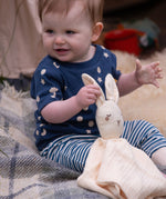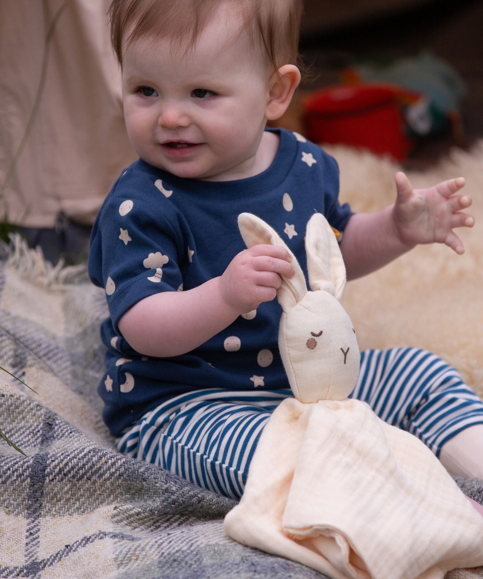 A baby wearing the Little Green Radicals  Full Moon T-Shirt & Jogger outfit set. The baby is sitting on a blanket with a cream coloured bunny comforter toy on their lap.