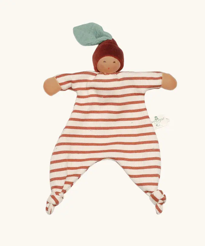 The little baby’s sweet face is hand painted with soft brown eyes, a tiny dot mouth, and gentle blush. A velveteen chestnut cap with a green muslin leaf gives this comforter its cosy character. The blanket body is made from organic cotton in a cream shade with warm brown stripes, and is left unfilled so it stays soft, flexible, and easy for babies to grasp, chew, and explore. The feet are knotted to add another tactile detail for sensory play.
