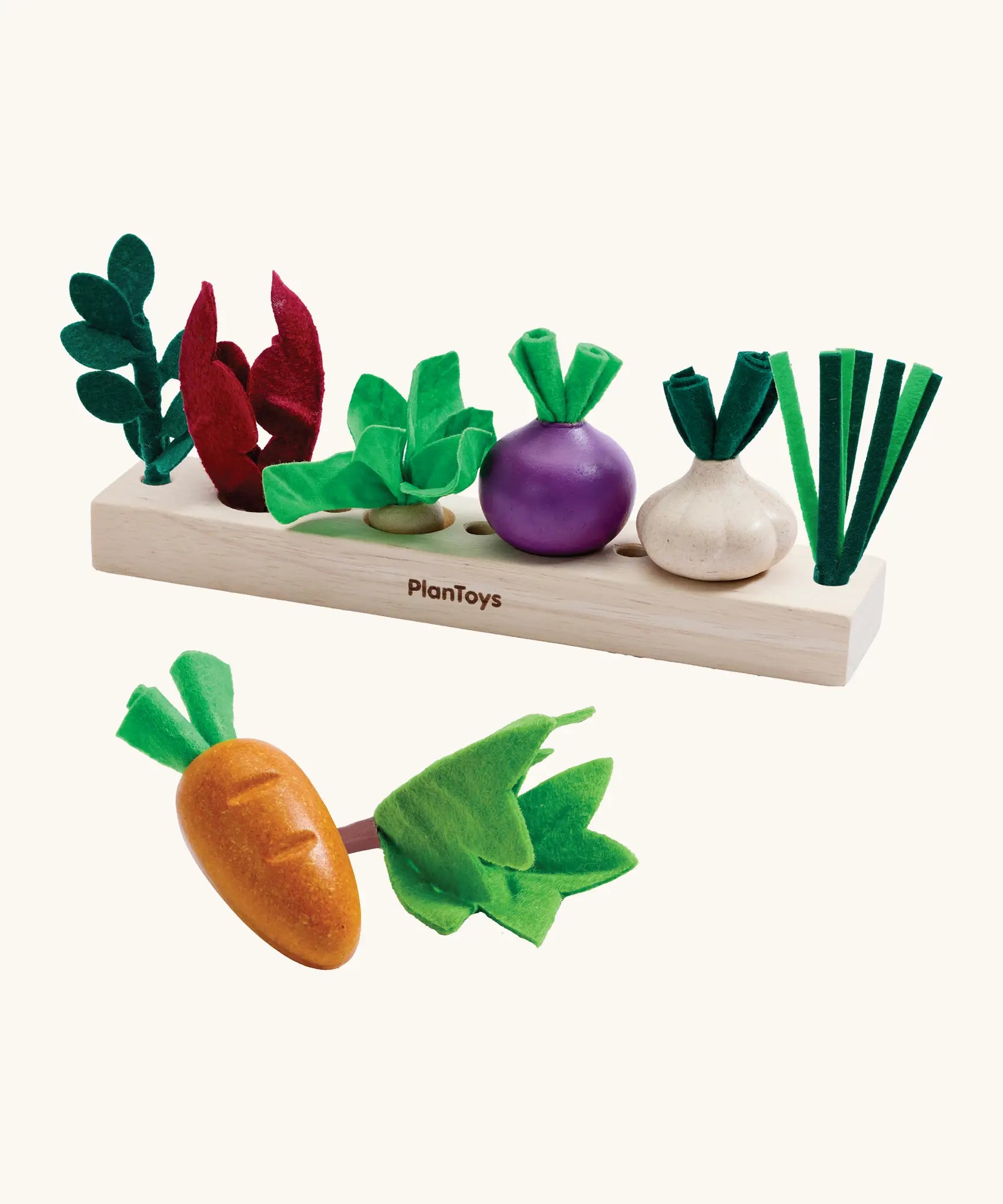PlanToys wooden seedling planter with veg sitting on top and a child picking up a loose felted veg piece