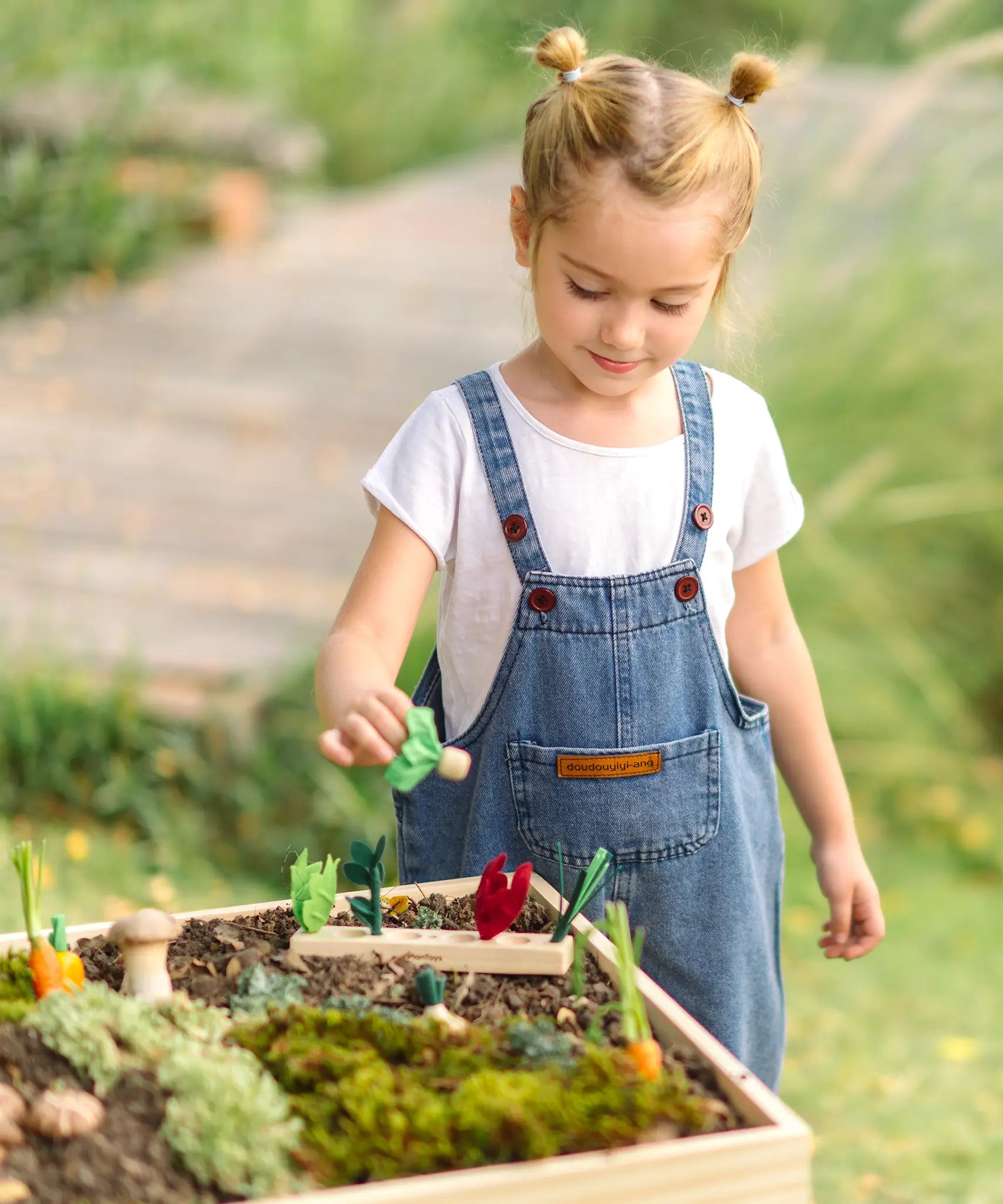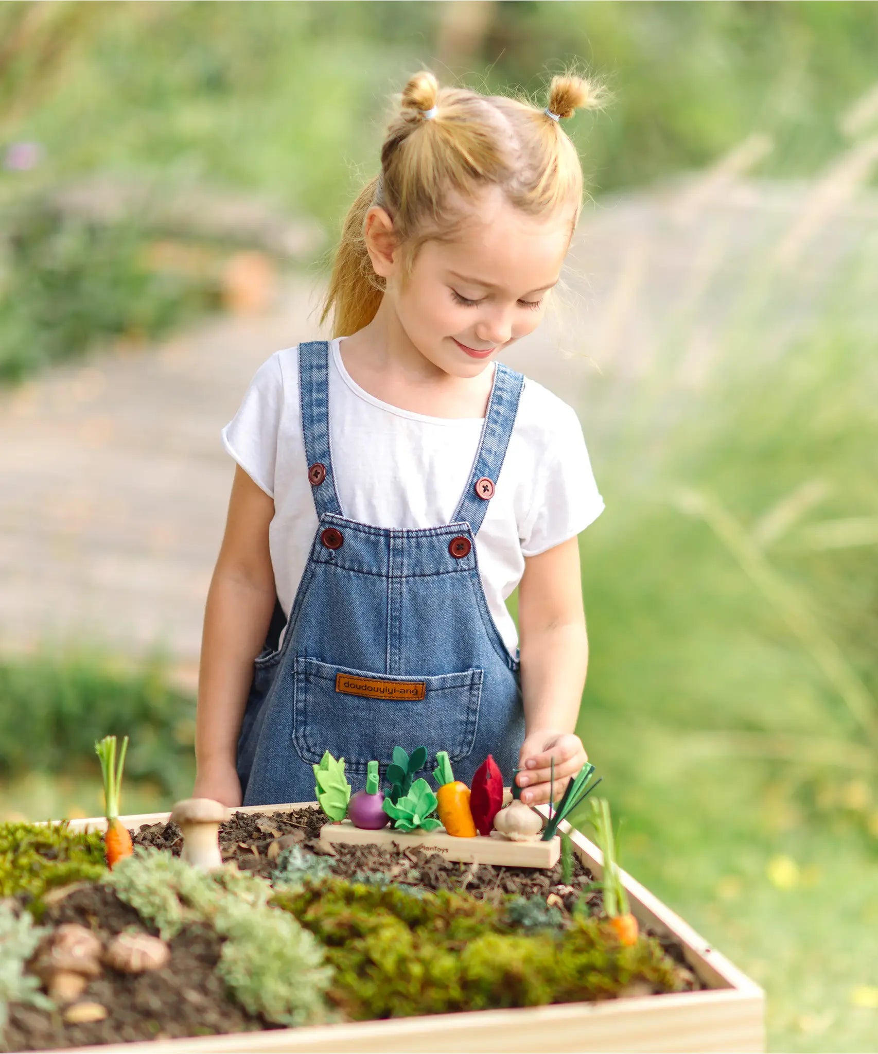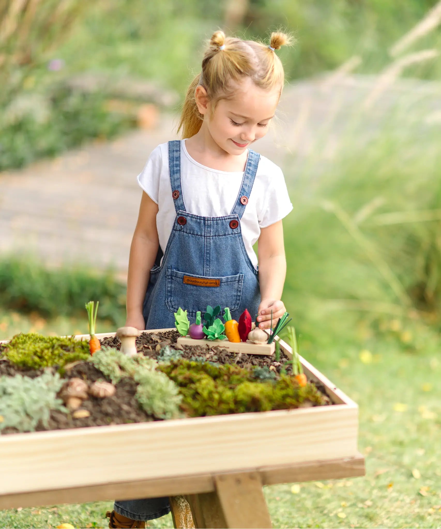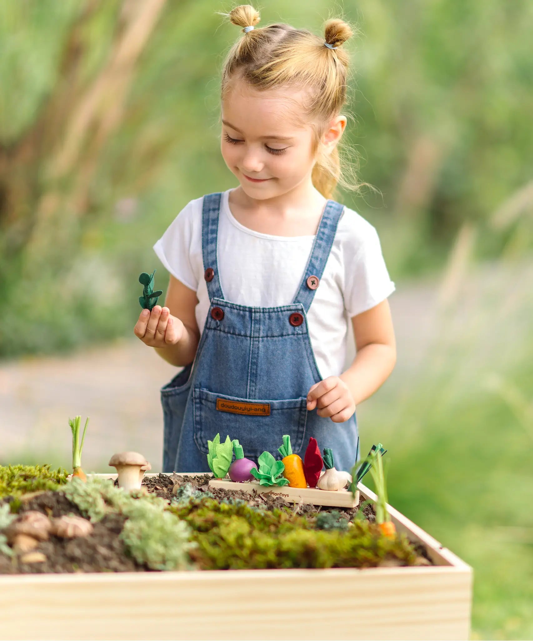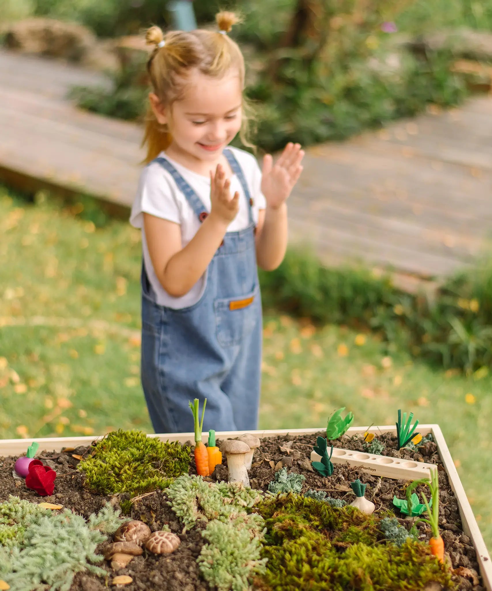 Child sorting loose wooden veg pieces on a PlanToys seedling planter piece in the garden