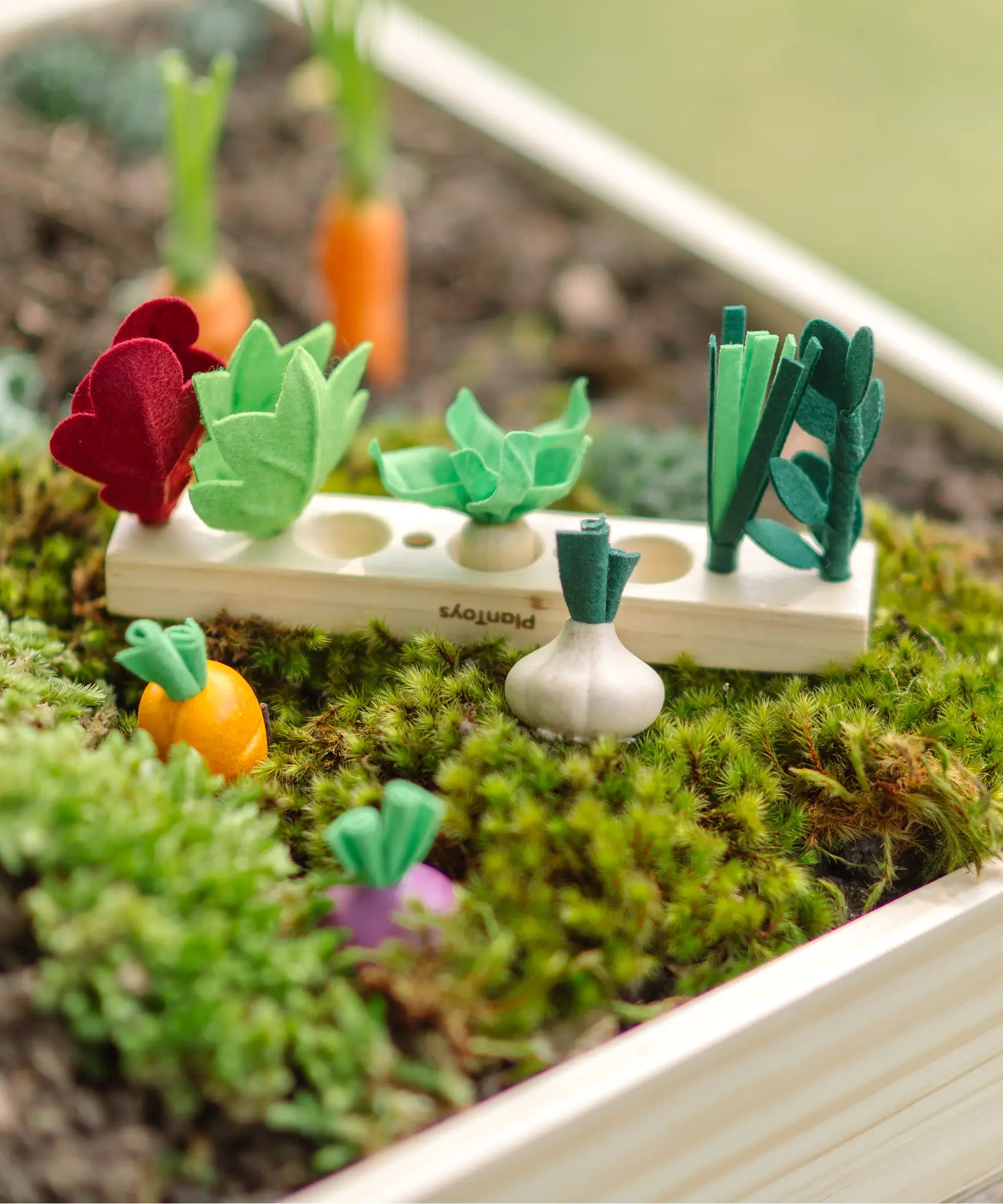 PlanToys wooden seedling patch set showing loose veg sitting on top of planting bed.