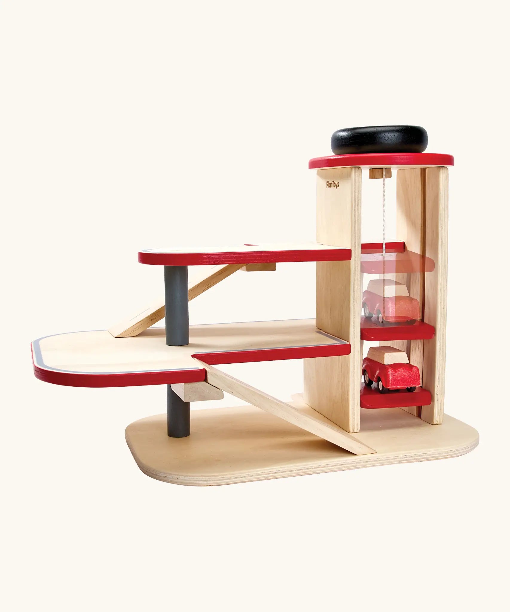 PlanToys wooden city parking garage showing a red vehicle going up a ramp