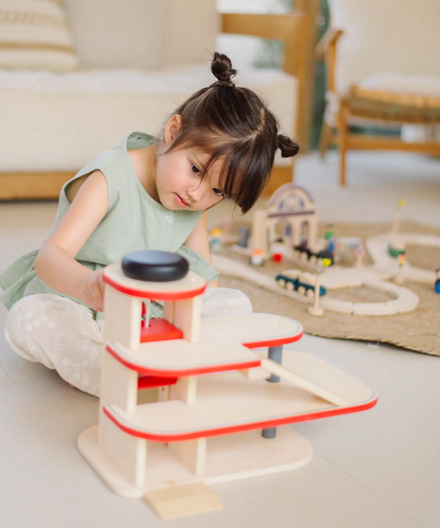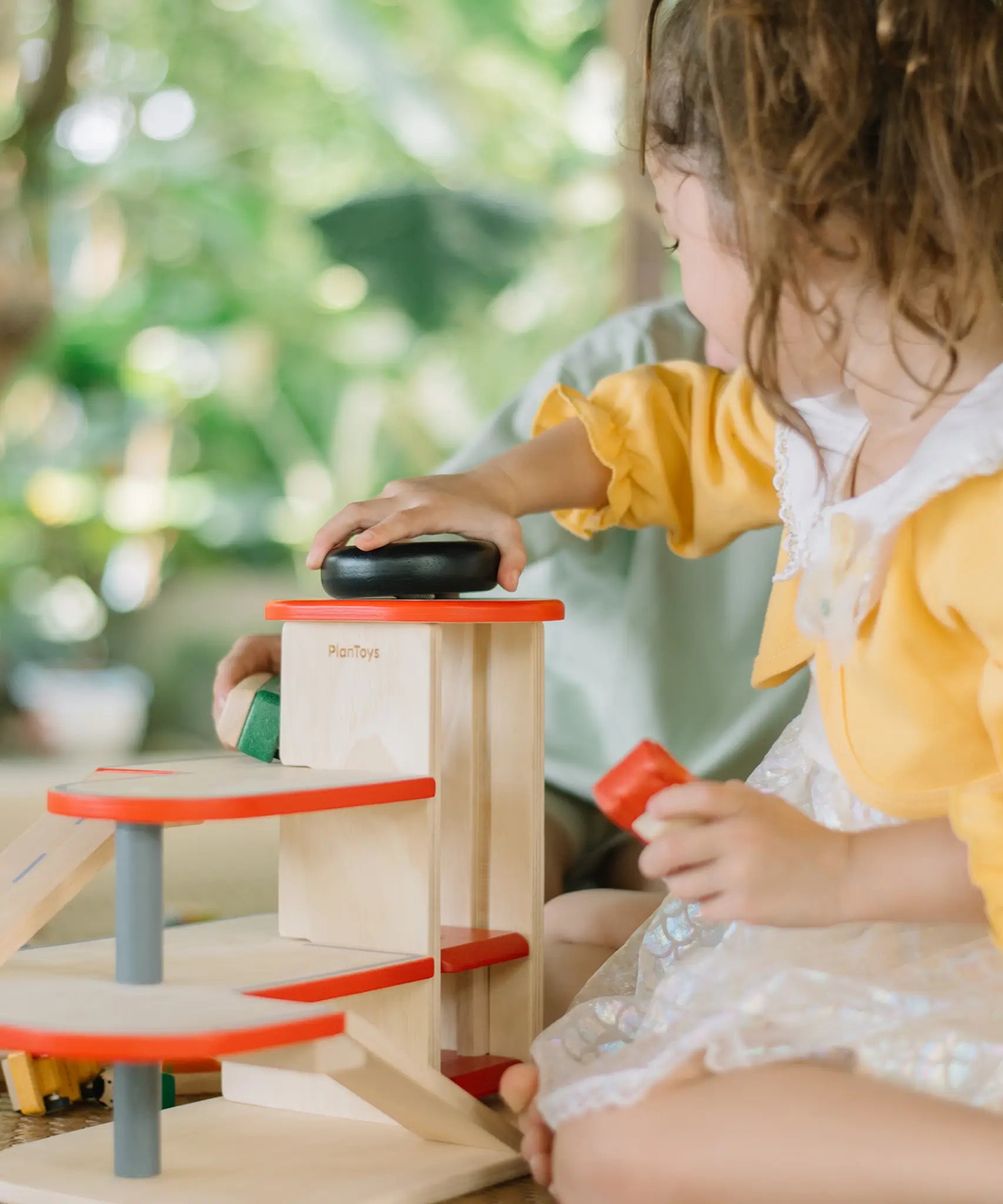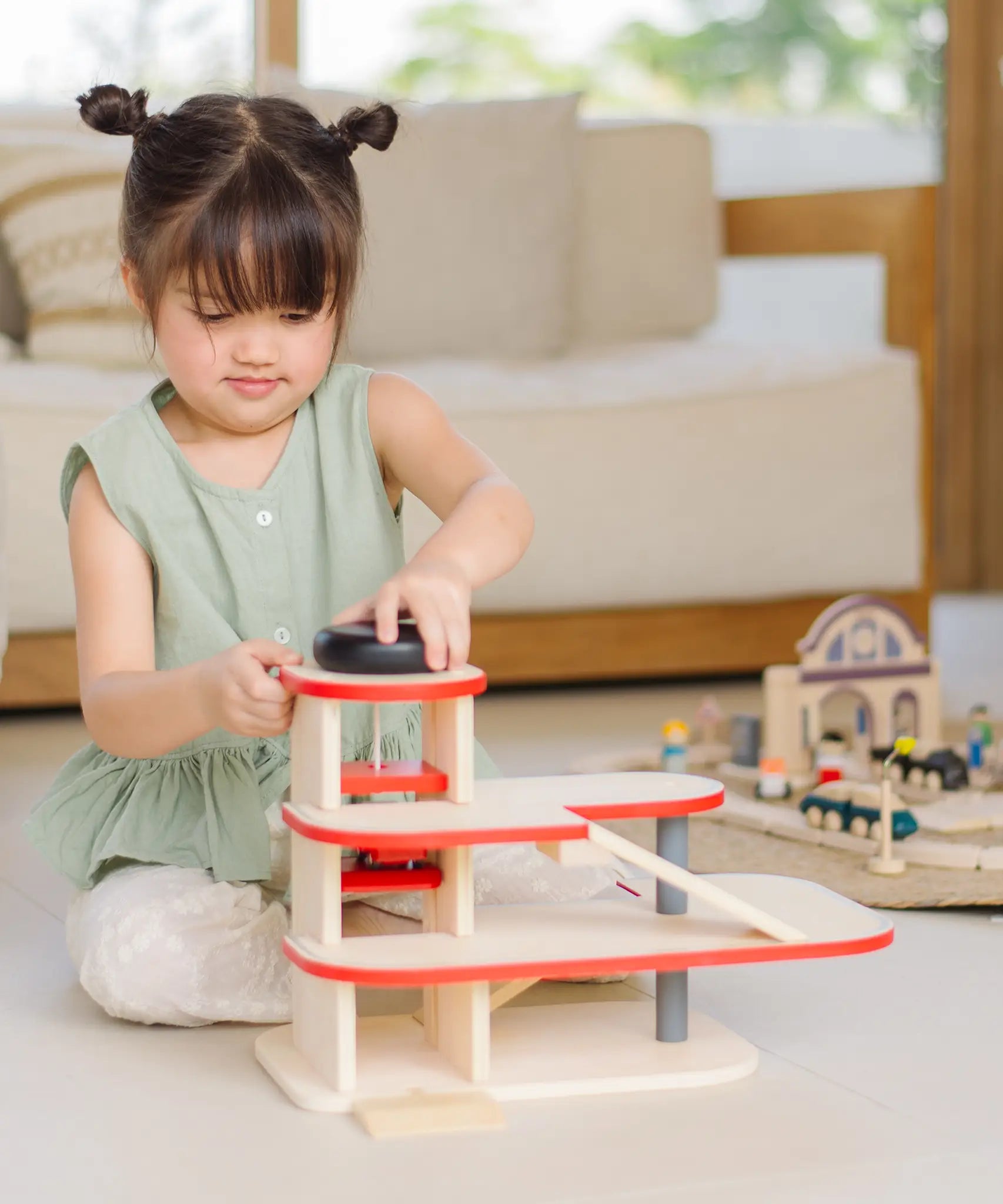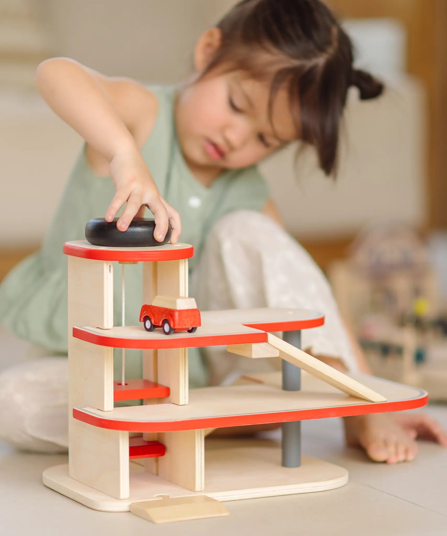The PlanToys City Parking Garage is a three-storey wooden car park toy designed for small-world city and town play. With ramps, a toy car, and a working car lift, this multi-level parking garage gives children plenty of opportunities for hands-on vehicle play while supporting fine motor skills and hand-eye coordination.