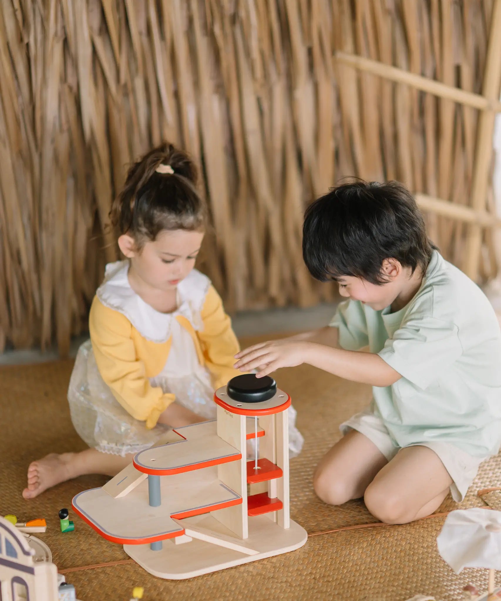 Children playing with the PlanToys wooden city parking garage using the wind up lift