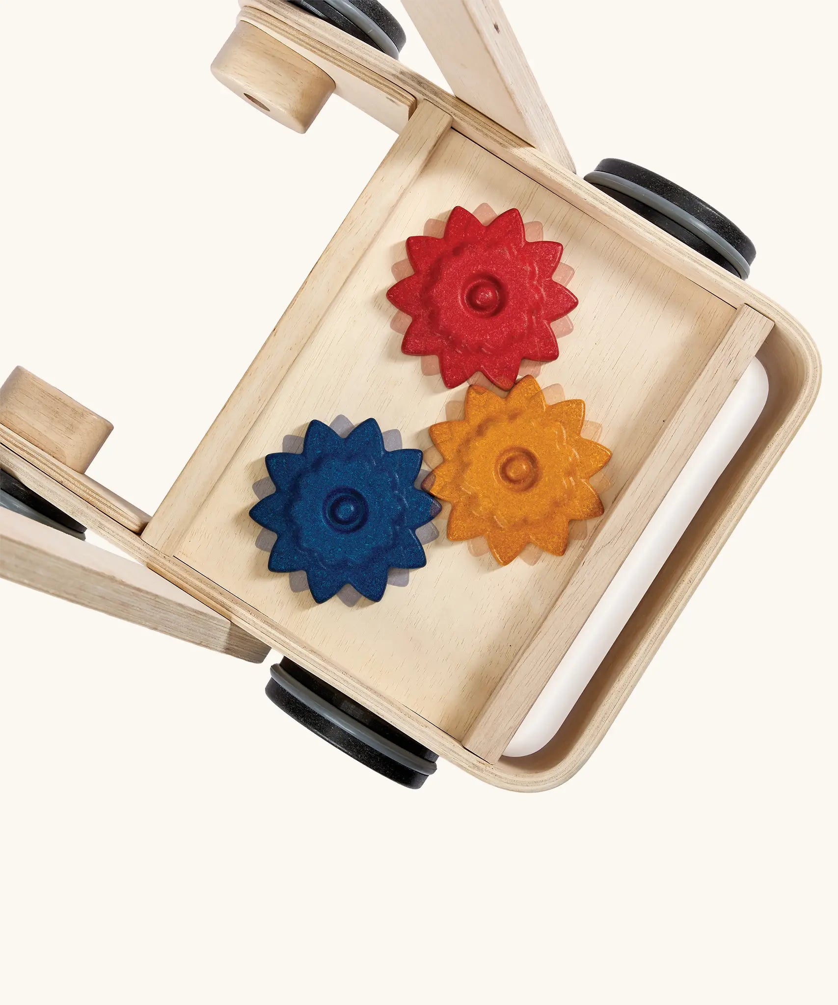 Overhead view of the PlanToys gear & go push along wooden baby walker.  The Base has three wooden gear cogs that turn.