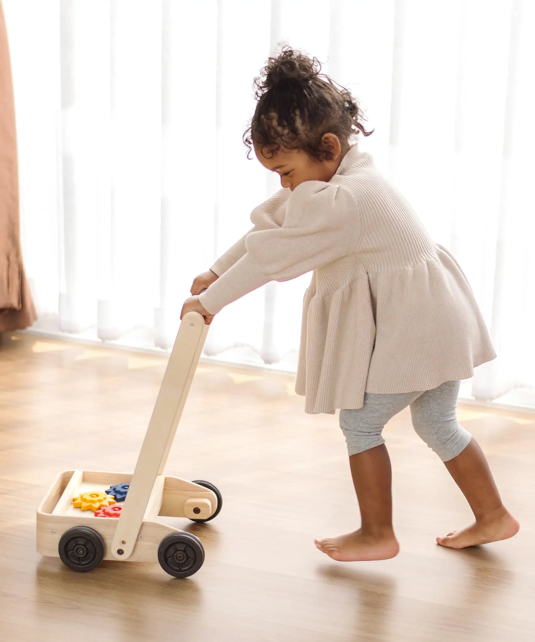 Child pushing the PlanToys gear & go push along wooden baby walker.