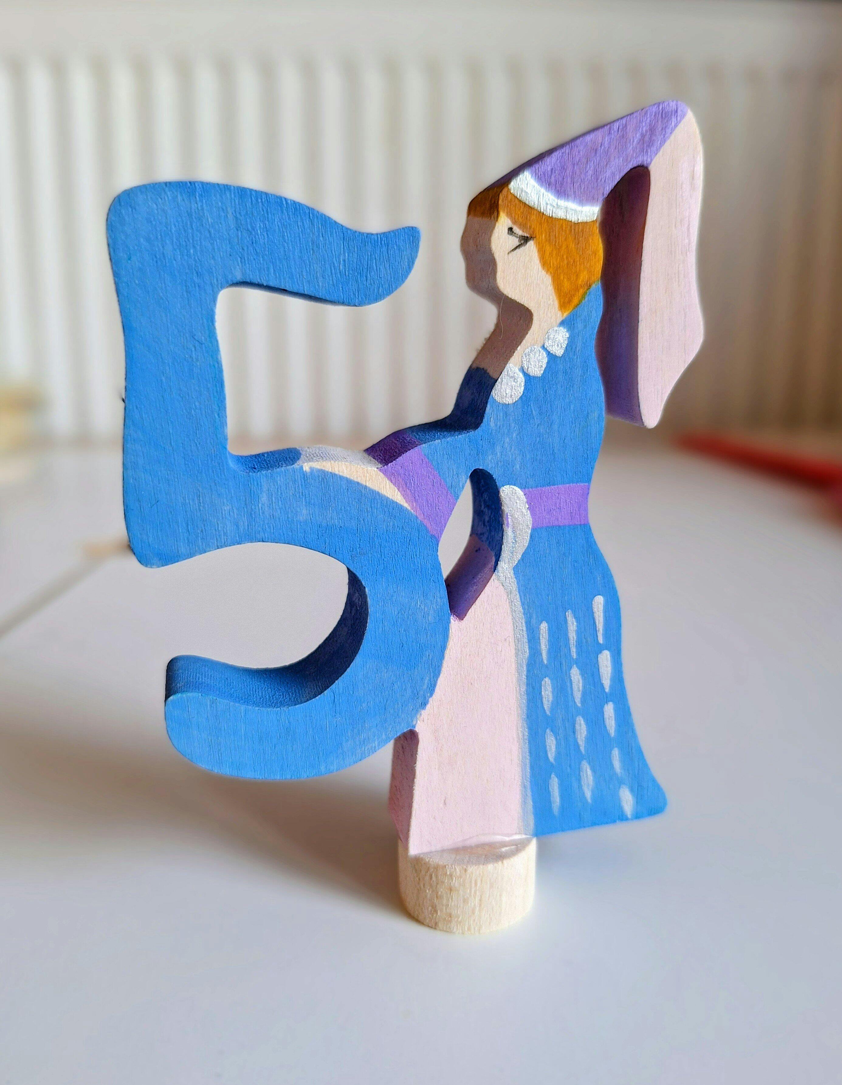 Grimms number 5 fairy decorative figure available at Babipur. A light blue wooden number 5 figure with a blue and pink princess latching on.