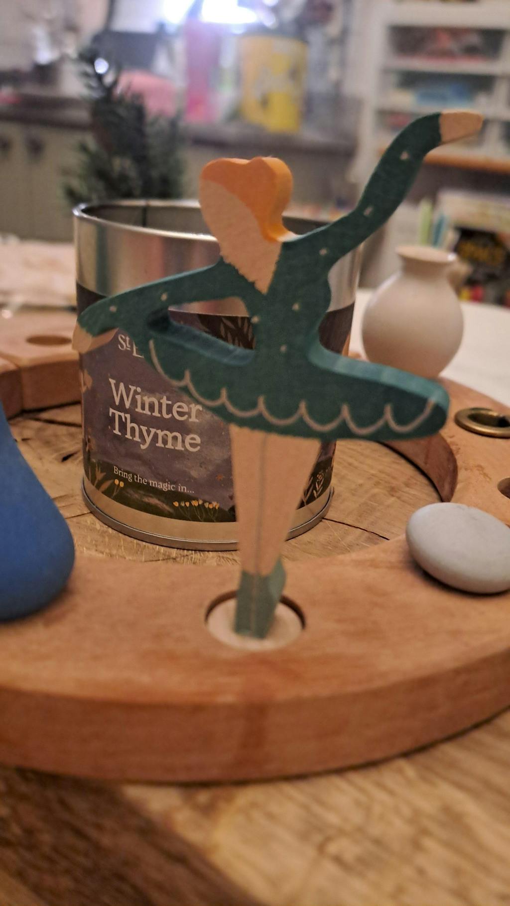A Grimms wooden ballerina decorative figure in blue. Features a small base on the bottom to slot into the celebration ring.