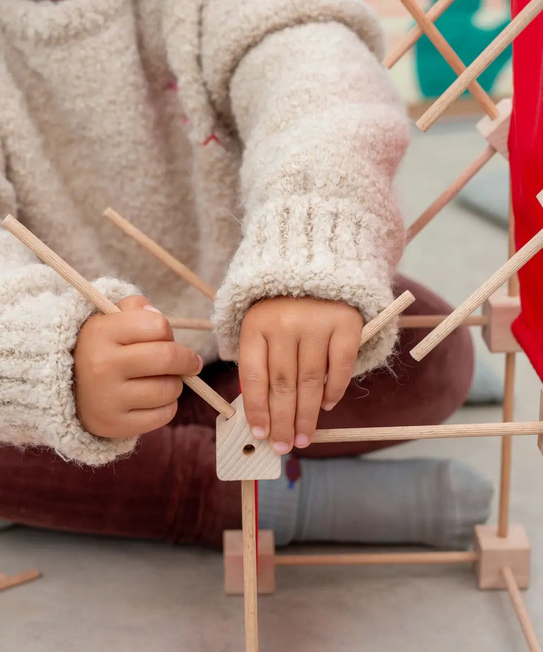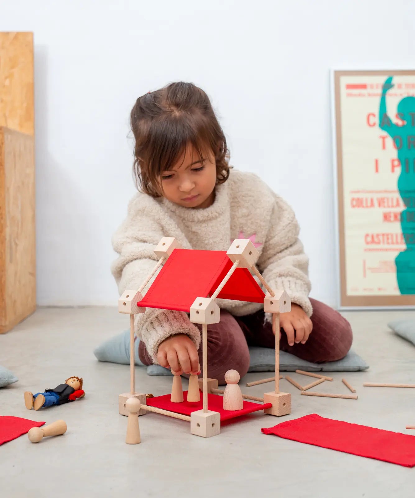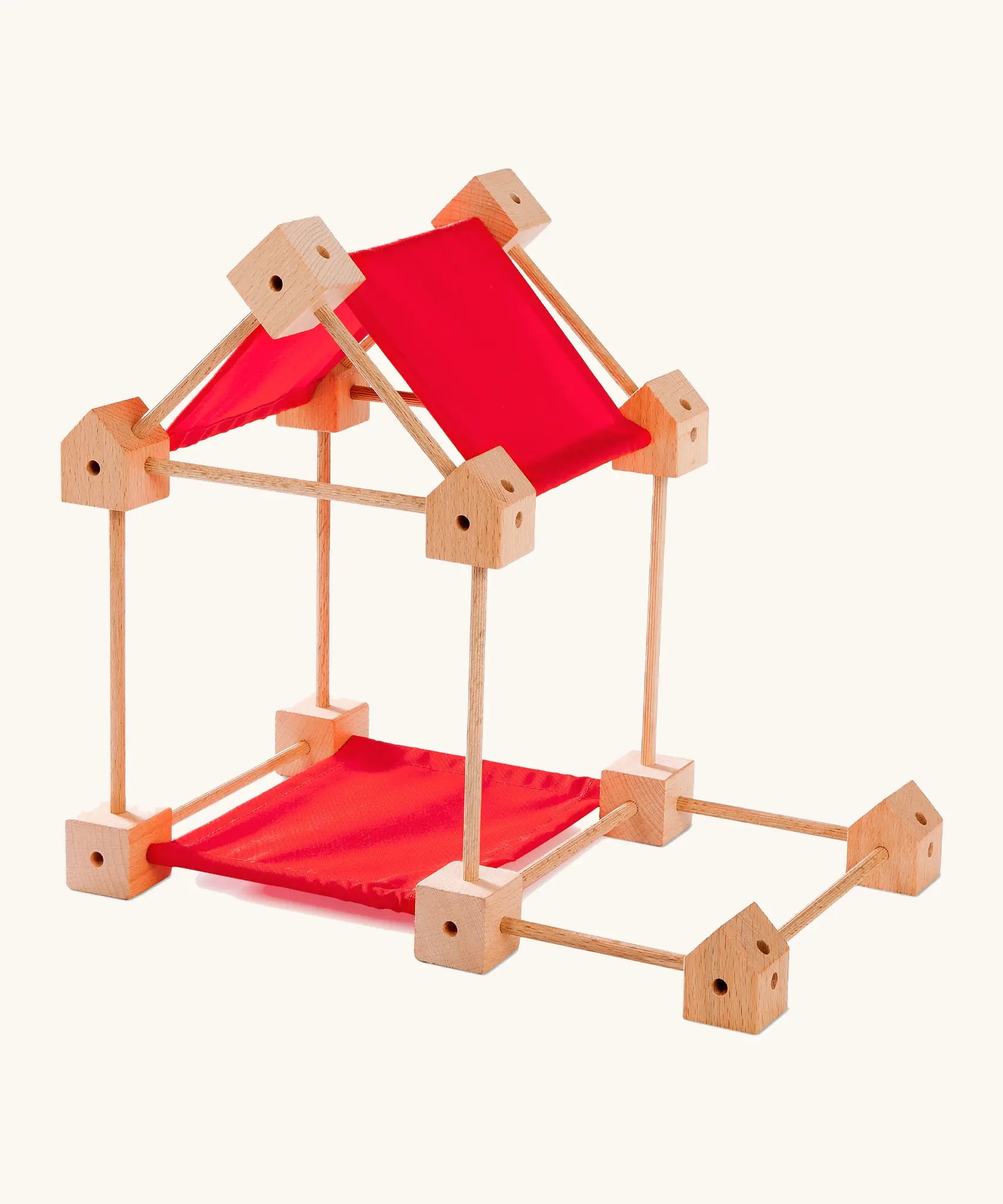 Trigonos wooden mini construction set showing a simple house build made from poles, cube corner blocks and red cotton sheets