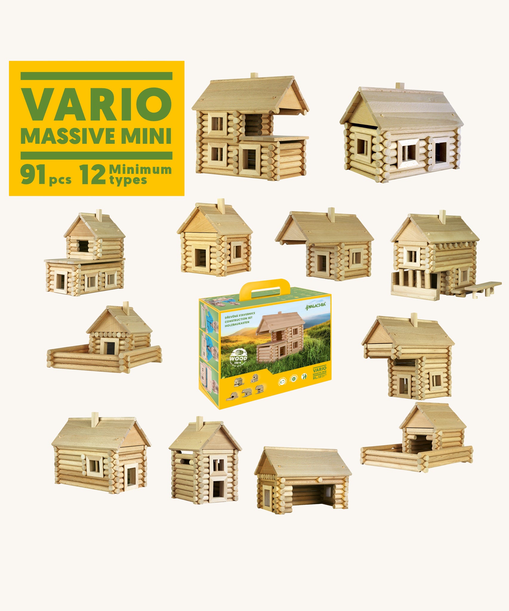 Ce mini-ensemble Walachia Vario Massive est un passionnant ensemble de construction en bois de 91 pièces qui peut être utilisé pour construire douze modèles de bâtiments différents. Composé d'une série de bûches qui se verrouillent entre elles grâce à leurs découpes demi-rondes et de fenêtres et portes en bois intelligemment conçues pour s'emboîter sur les bûches. Les enfants adoreront explorer les différentes variantes de construction et construire leurs propres modèles.