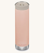 A close up of a person's hand holding onto the peack parfait pink coloured Klean Kanteen 20oz TKWide Cafe.