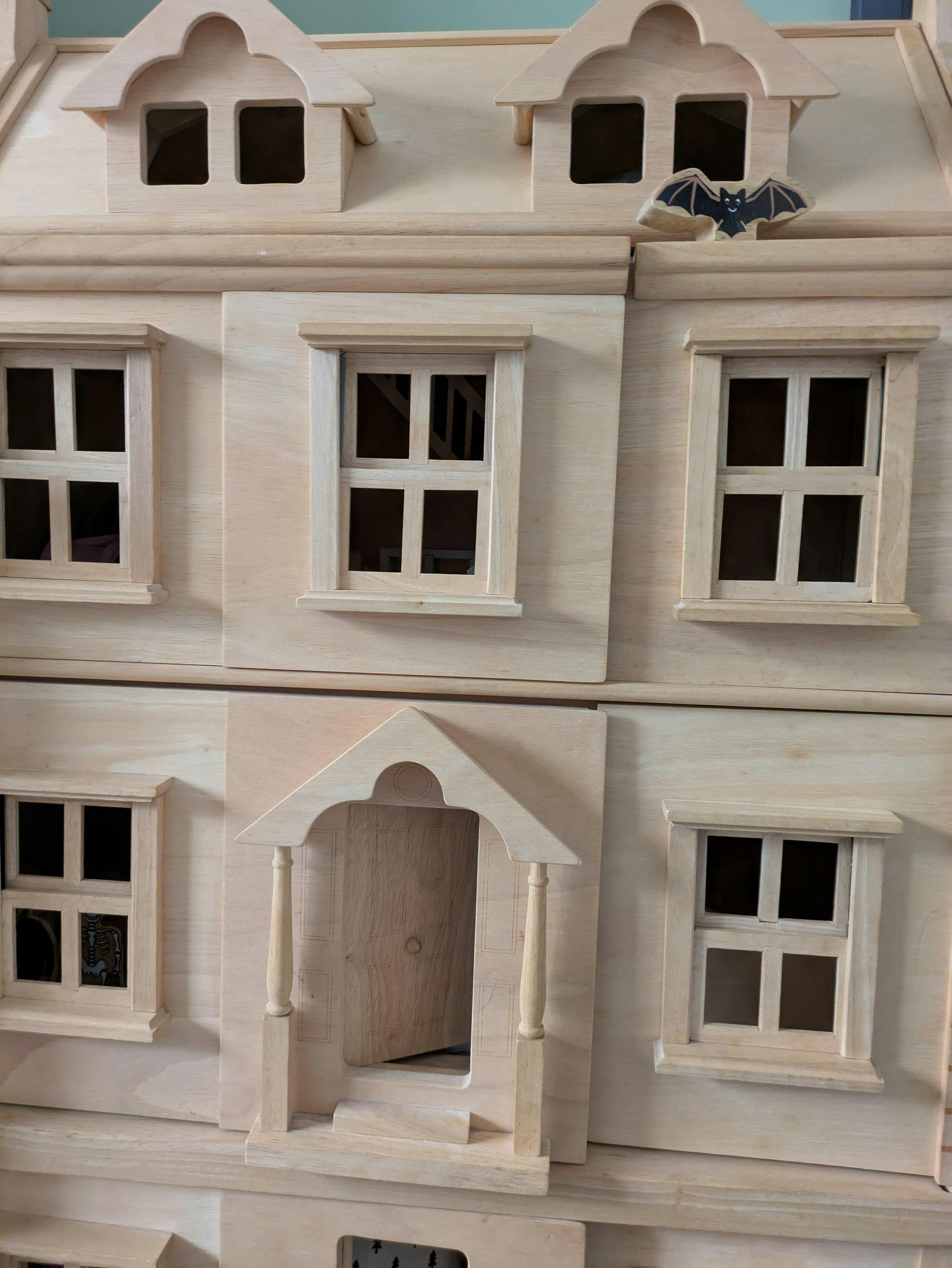 A Lanka Kade wooden toy bat placed on the ridge of the roof of an Osthemer wooden toy cottage.