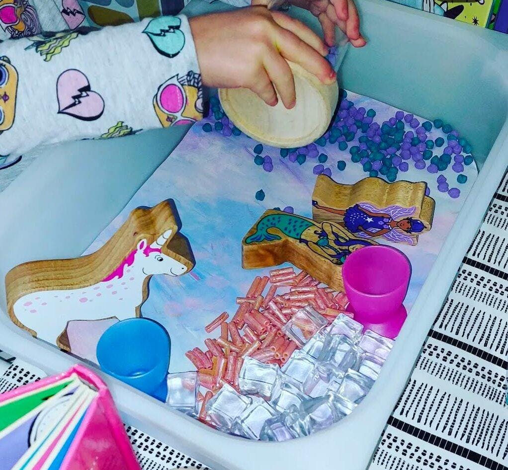 A close up of a Lanka Kade wooden unicorn figure in a child's hand. The Lanka Kade wooden toy castle can be seen in the background.